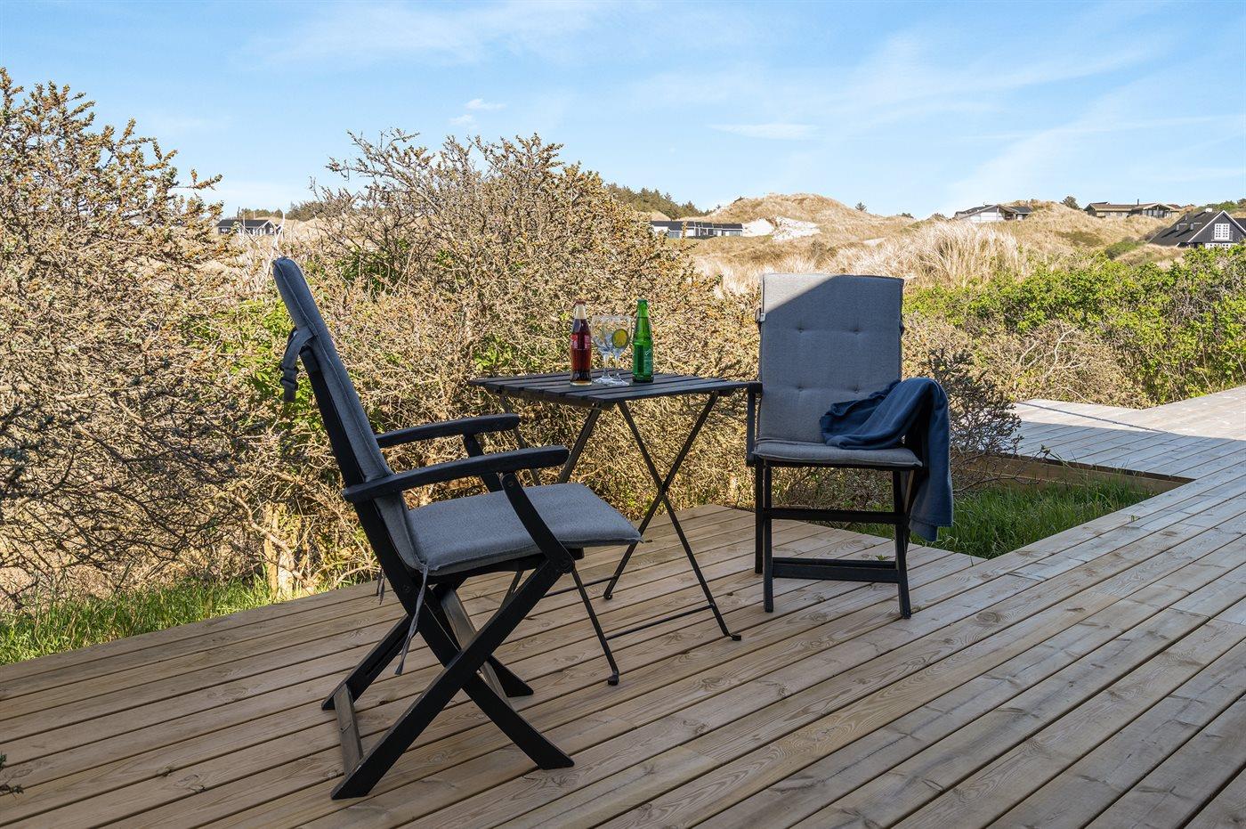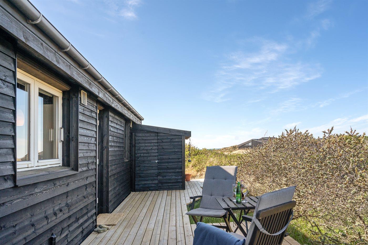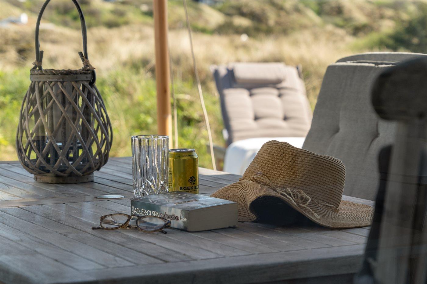 Morgenkaffen nydes i morgensolen på østsiden foran køkkenet og den dalende aftensol over baglandets klitter nydes bag læhegnet på vestsiden af huset. Er du til solnedgang over vesterhavet, kan denne nydes fra den separate terrasse i klitten.