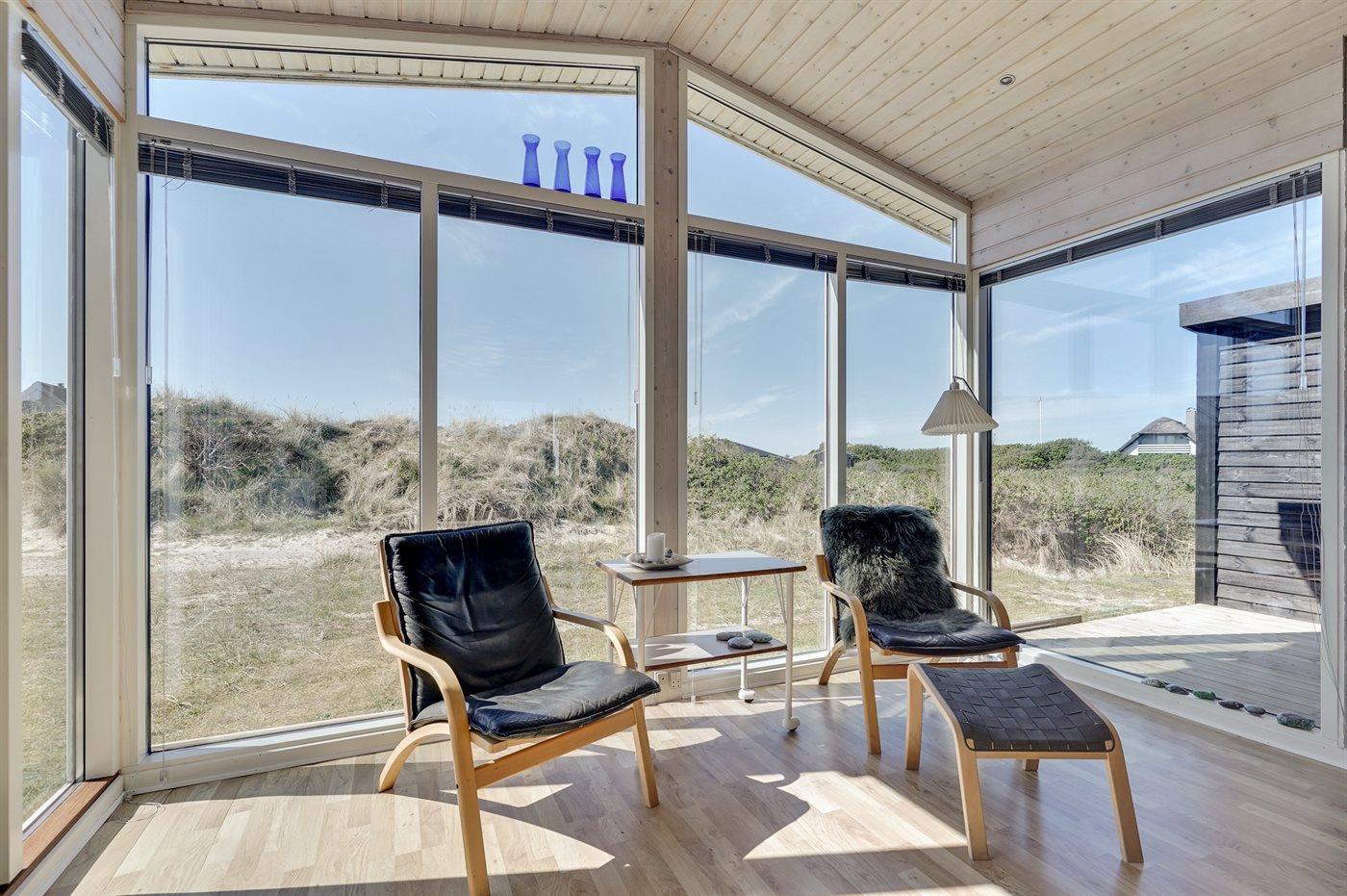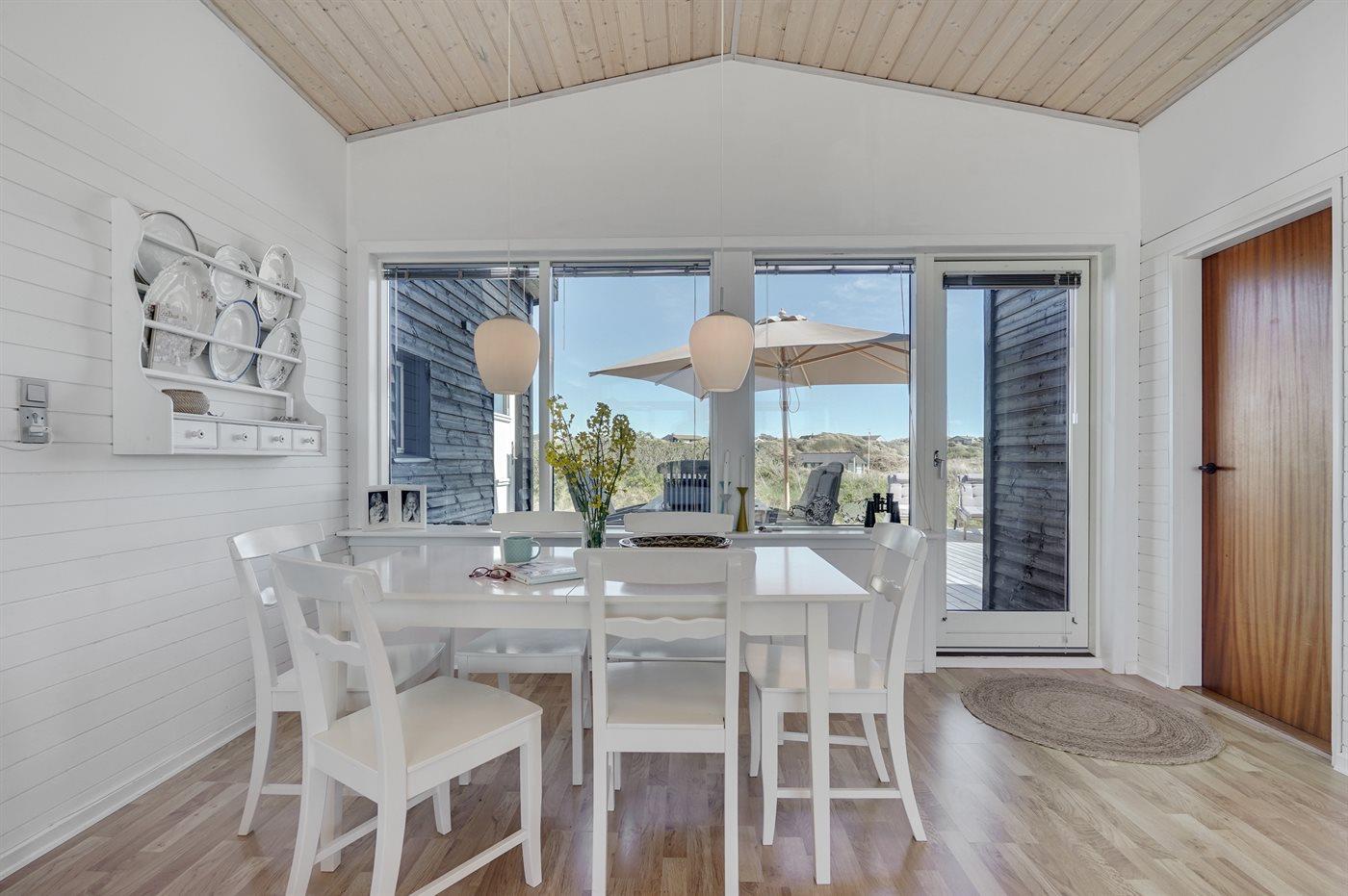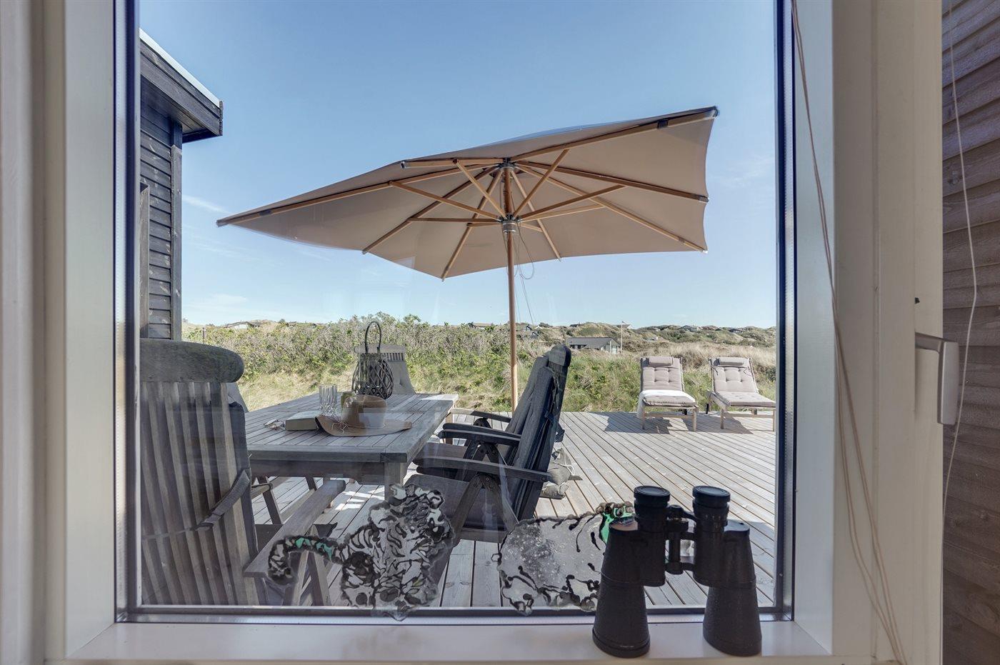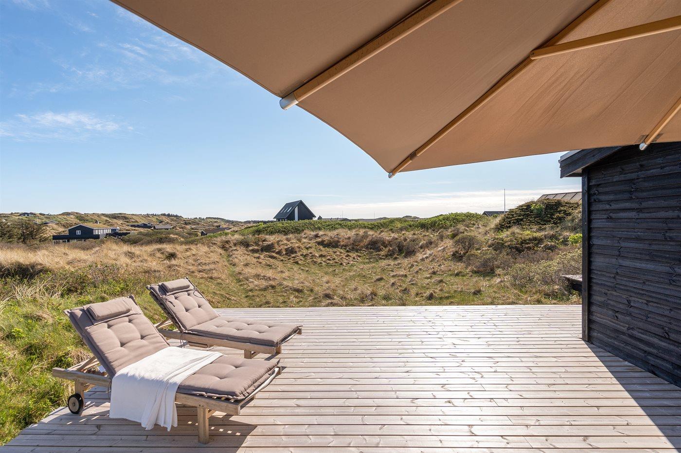 Morgenkaffen nydes i morgensolen på østsiden foran køkkenet og den dalende aftensol over baglandets klitter nydes bag læhegnet på vestsiden af huset. Er du til solnedgang over vesterhavet, kan denne nydes fra den separate terrasse i klitten.