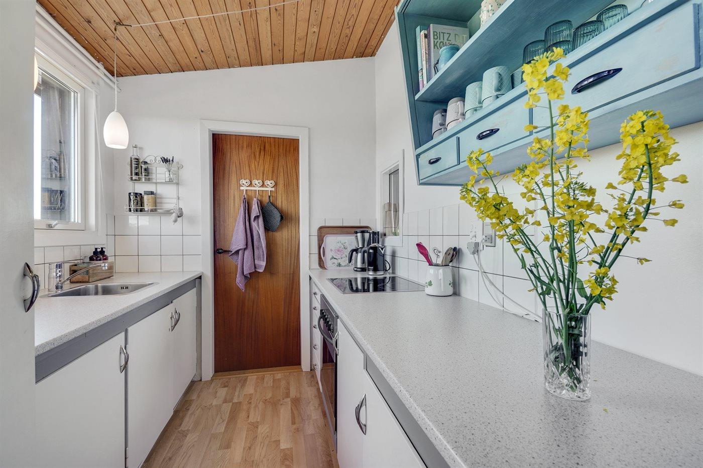 Køkkenet er udstyret med 1 køleskab. Der er 4 keramiske kogeplader, varmluftovn, mikrobølgeovn samt opvaskemaskine.