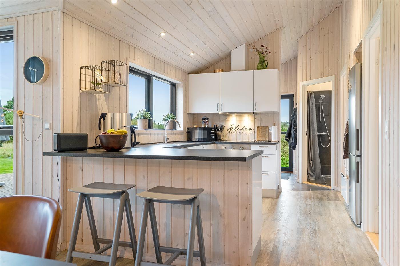 Køkkenet er udstyret med 1 køleskab. Der er 4 induktionskogeplader, varmluftovn, mikrobølgeovn samt opvaskemaskine.
