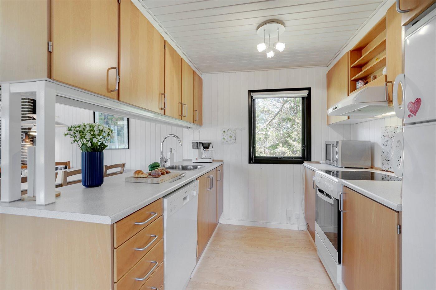 Køkkenet er udstyret med 1 køleskab. Der er 4 keramiske kogeplader, varmluftovn, mikrobølgeovn samt opvaskemaskine.