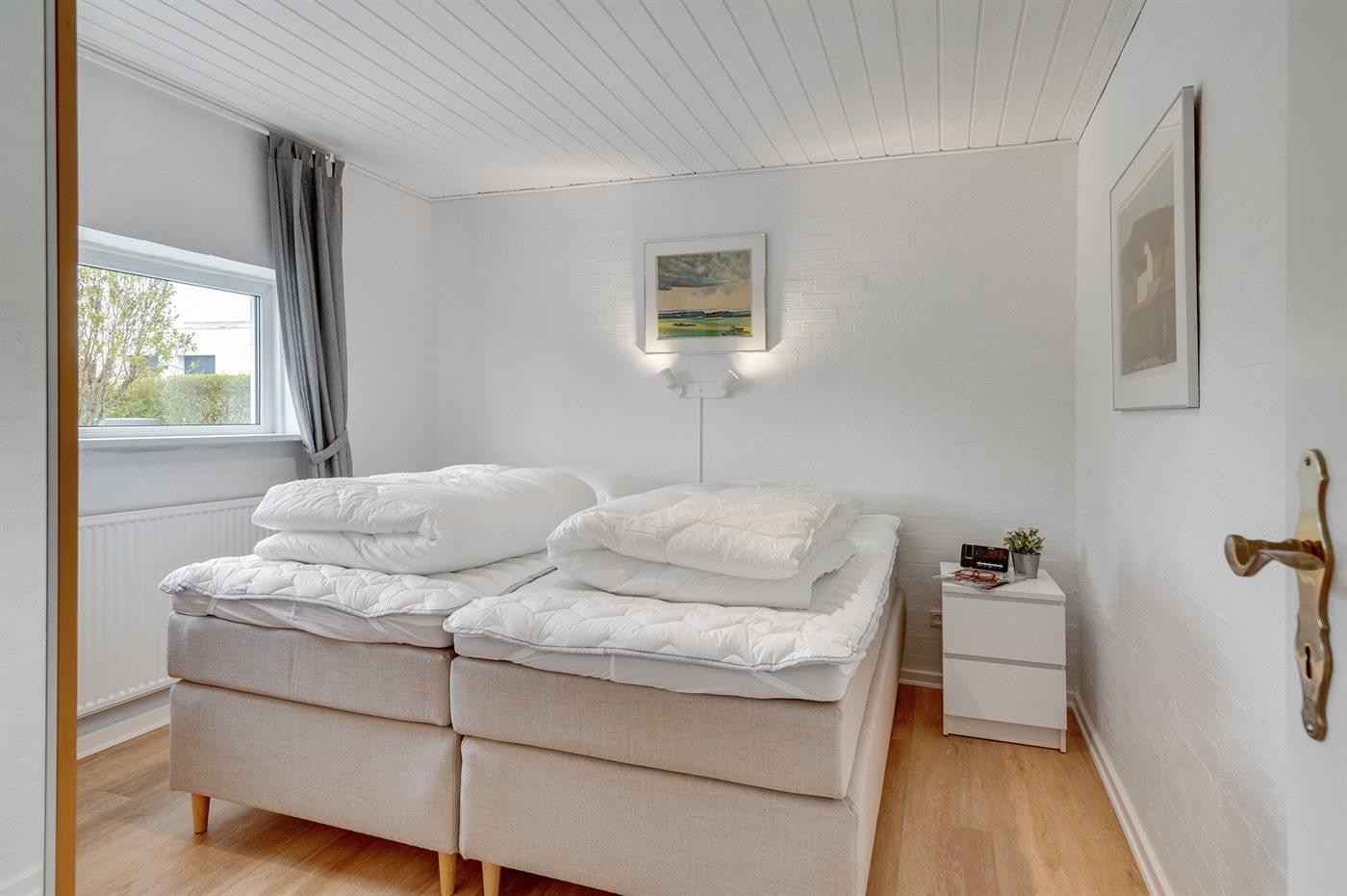 Der er i alt 3 soveværelser. Sovepladserne fordeler sig på: 4 sovepladser i dobbeltsenge. 2 sovepladser i enkeltsenge. Derudover er der 1 stk. barneseng.