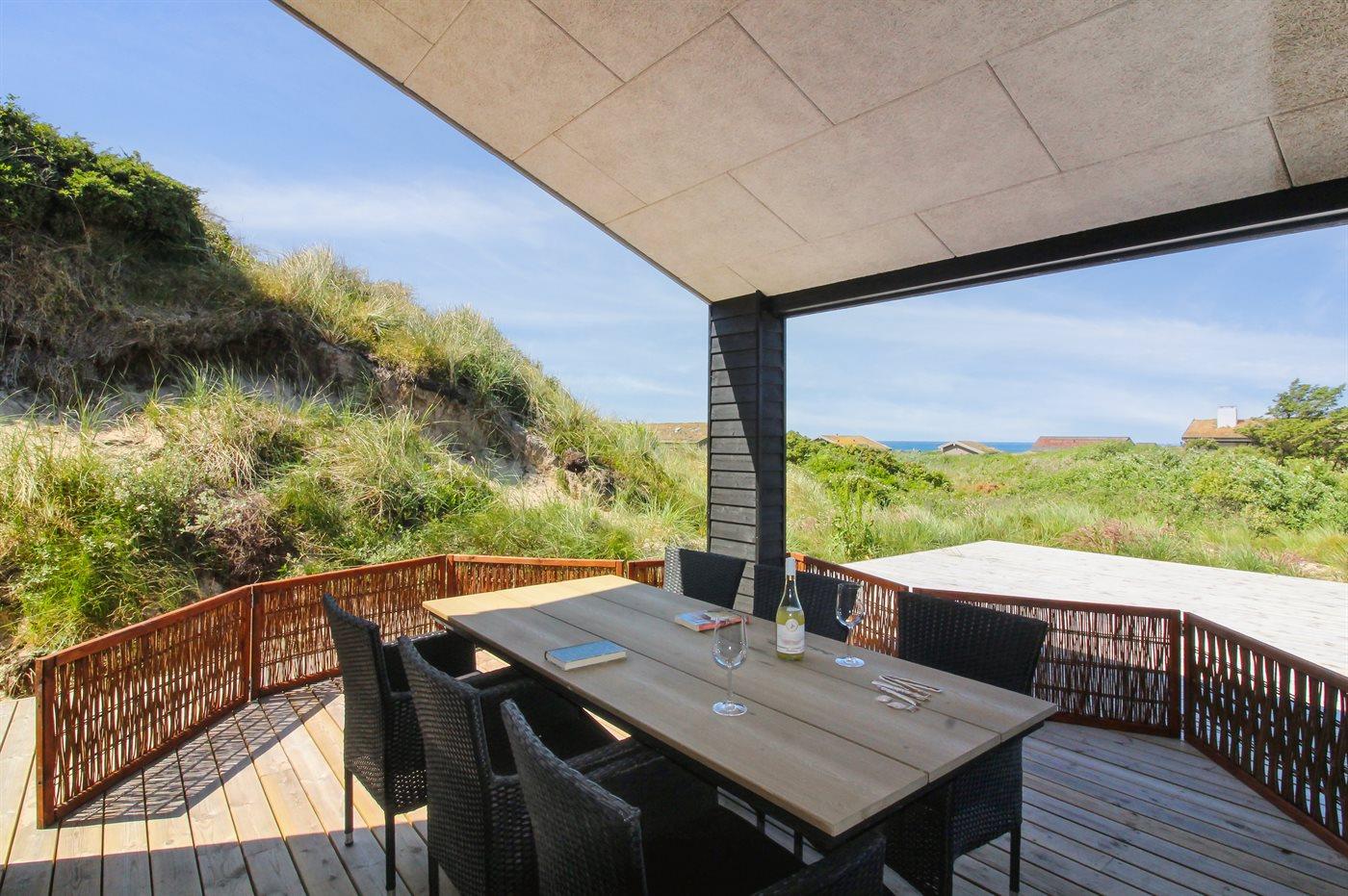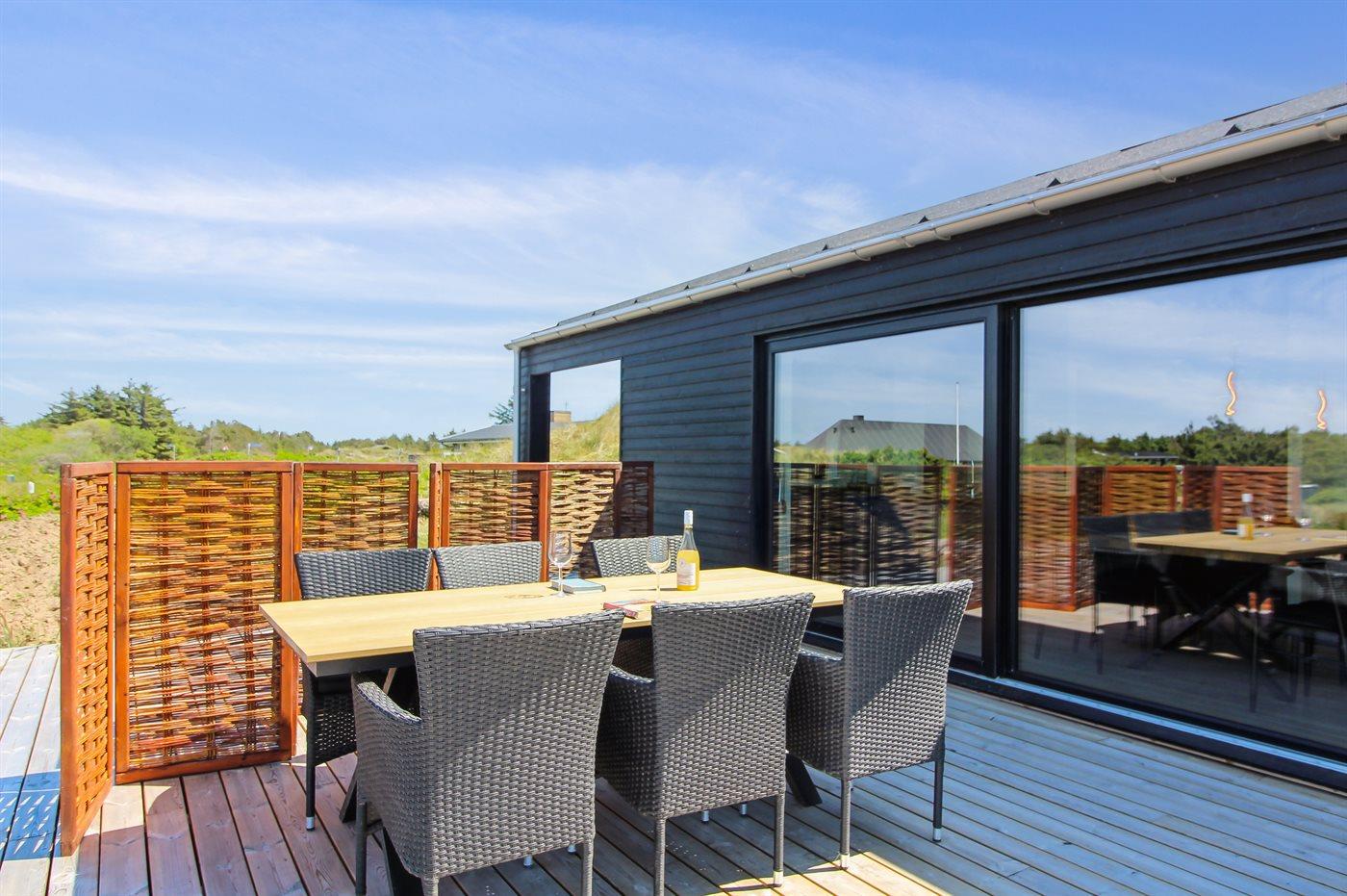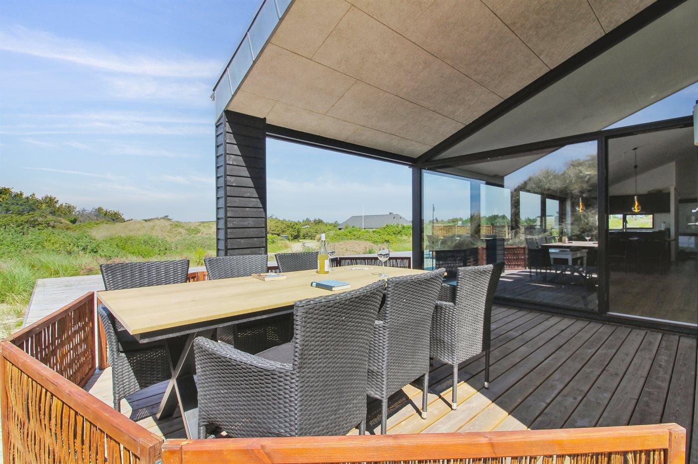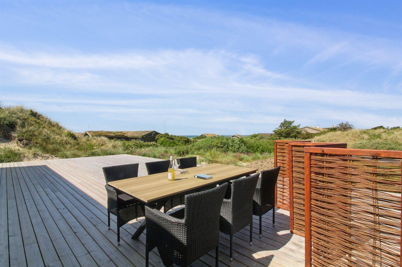 Ferieboligen er beliggende på en 2200 m² stor klitgrund. Der er 500 m til havet. Nærmeste forretning er beliggende i en afstand af 3000 m. Der er en golfbane i en afstand af 12000 m. Til ferieboligen hører 70 m² terrasseareal. Desuden er der 20 m² overdækket terrasse. Der er redskabsrum. Grill til rådighed. Parkering ved ferieboligen.