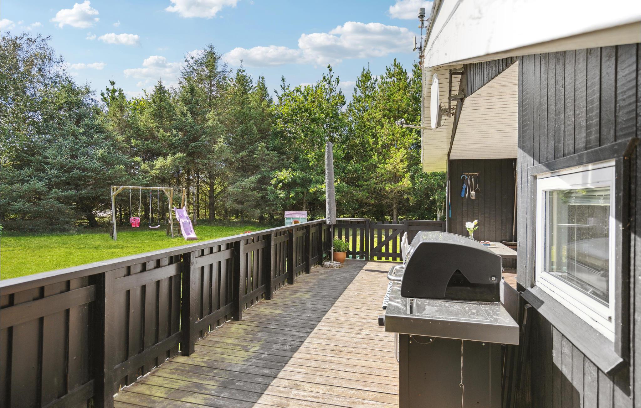 Haven er grøn og åben med plads til at løbe og lege. Der er legestativer til børnene og behagelige havemøbler, hvor I kan læne jer tilbage, mens grillen syder med lækre retter.