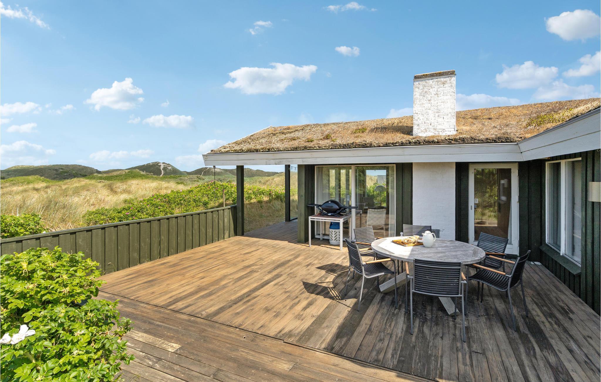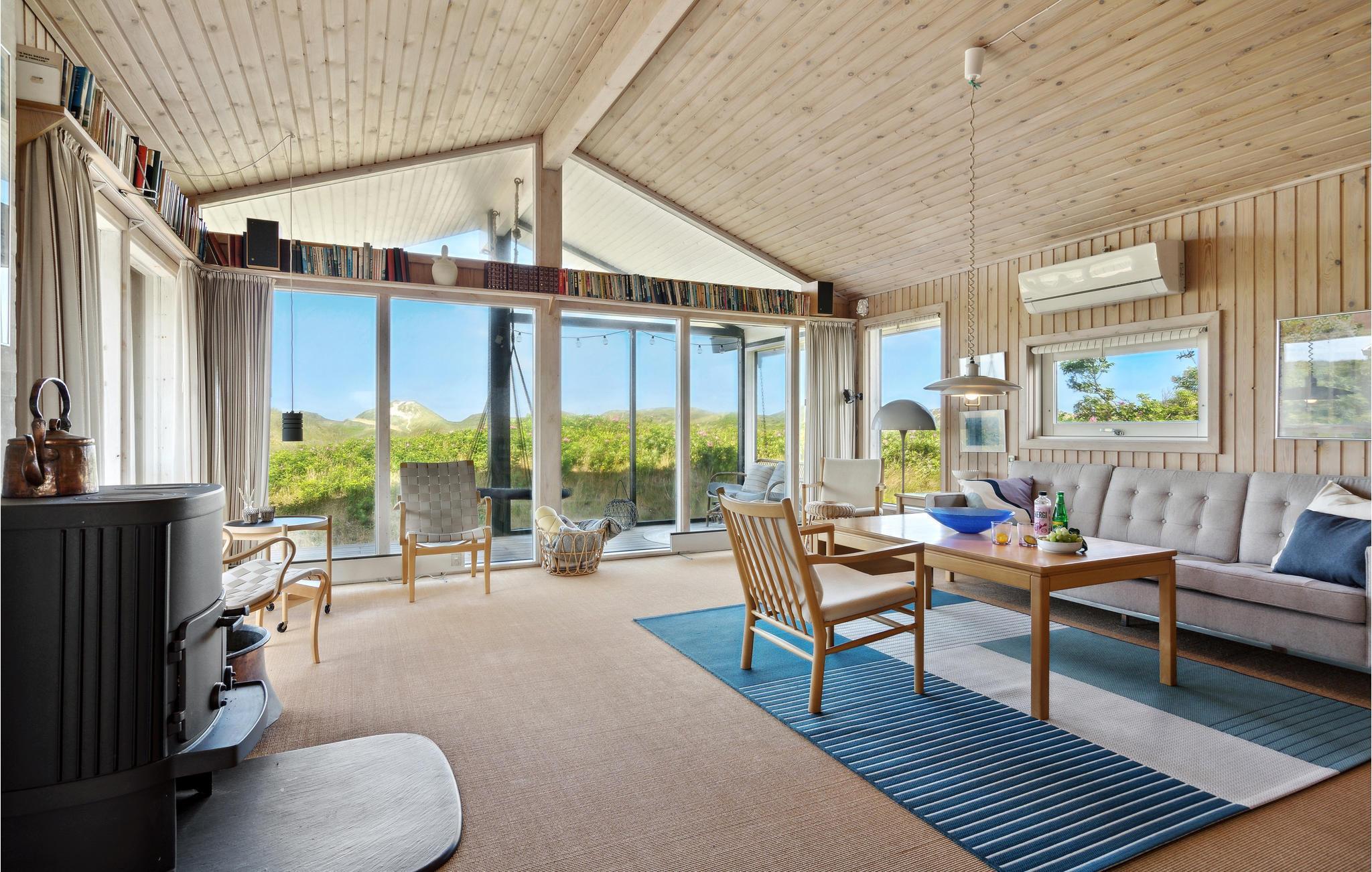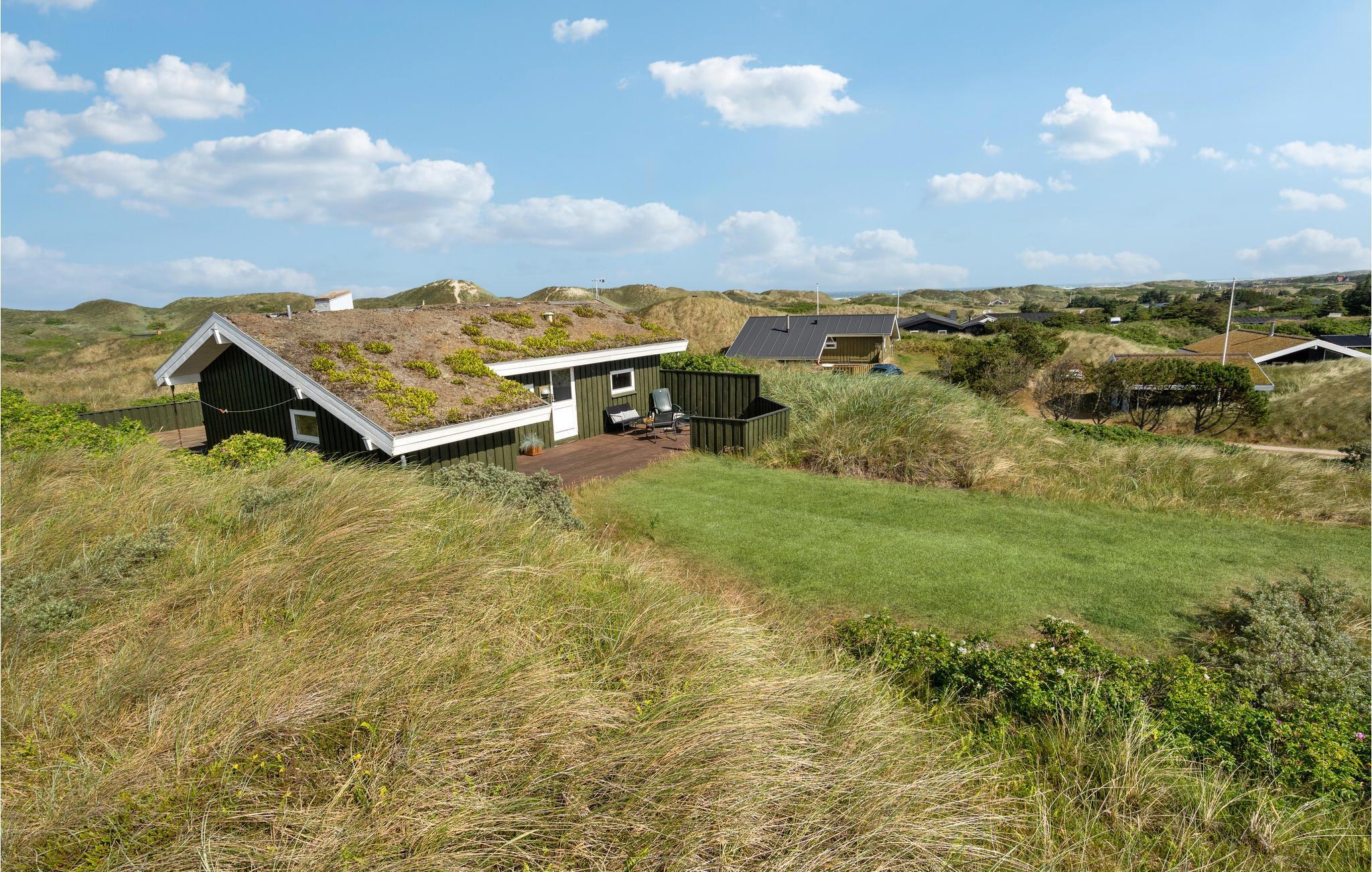 Længes I efter det brusende Vesterhav og hyggelige spilleaftener nær den knitrende brændeovn? Så har I fundet den perfekte bolig til årets sjove familieferie. Det hyggelige olivengrønne hus byder på klassisk sommerhuscharme og lyse træpaneler, der formår at skabe en beroligende atmosfære, hvor I kan føle jer hjemme og nyde udsigten over klitlandskabet gennem de store vinduer. Efter dagens aktiviteter kan I grille på den store terrasse, der løber rundt om huset, og herfra nyde udsigten og den smukke solnedgang. Gå op ad stien gennem klitterne til stranden. Den brede sandstrand, som også er åben for biler, giver jer masser af plads til at bygge sandslotte, bade og flyve med drager.