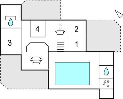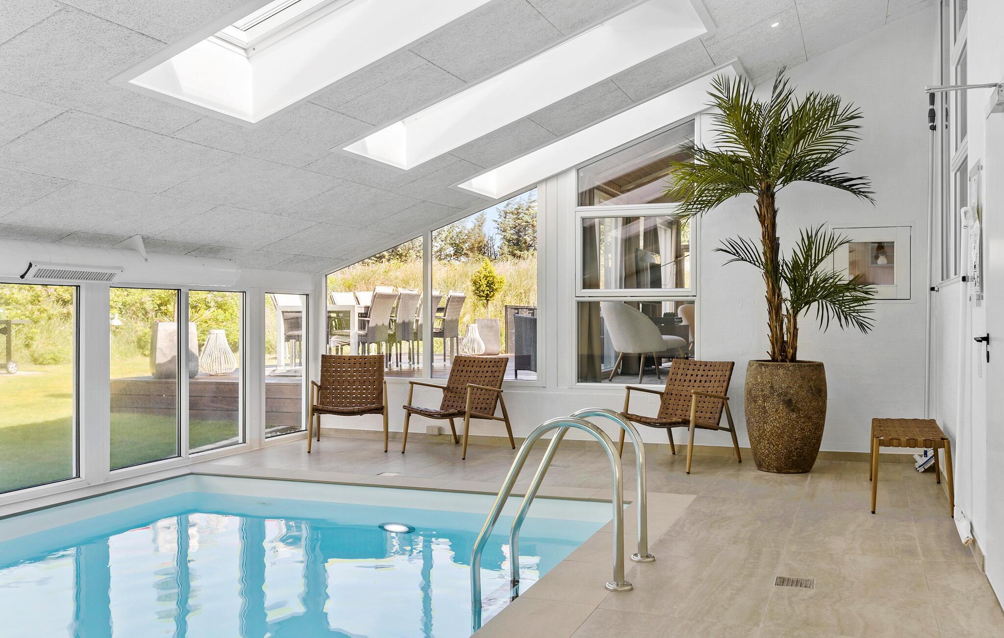 Huset råder over al moderne komfort. En af hovedattraktionerne er poolen, som kan ses fra både køkken/alrummet, stuen og to af husets tre terrasser. Den lyse poolafdeling indeholder udover den store pool et pænt badeværelse, sauna og stole til at slappe af i.