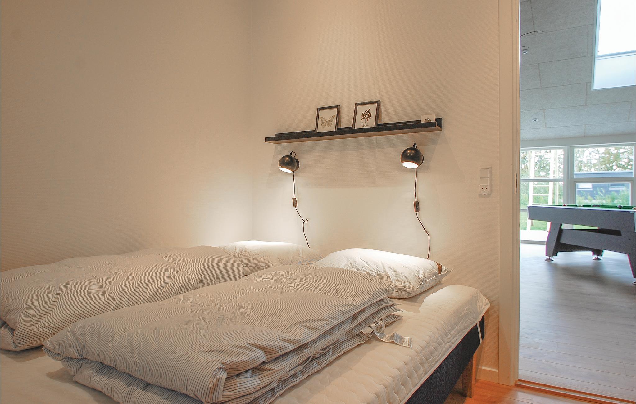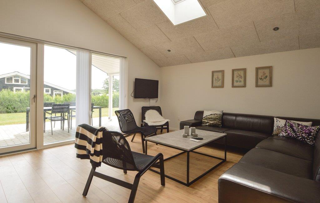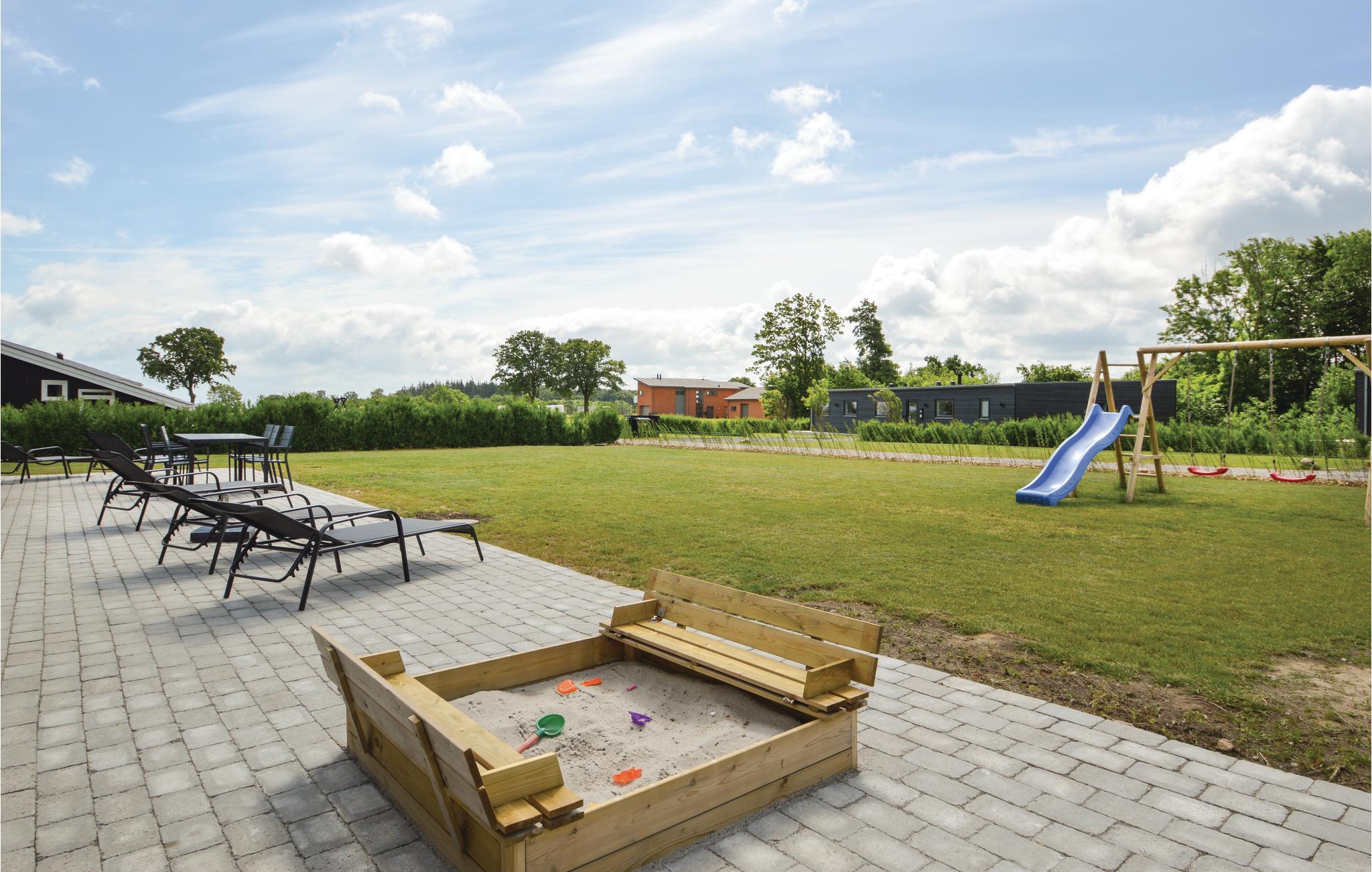 Moderne sommerhus nær strand og skov med wellness, aktivitetsrum og stor terrasse for en komfortabel ferie.