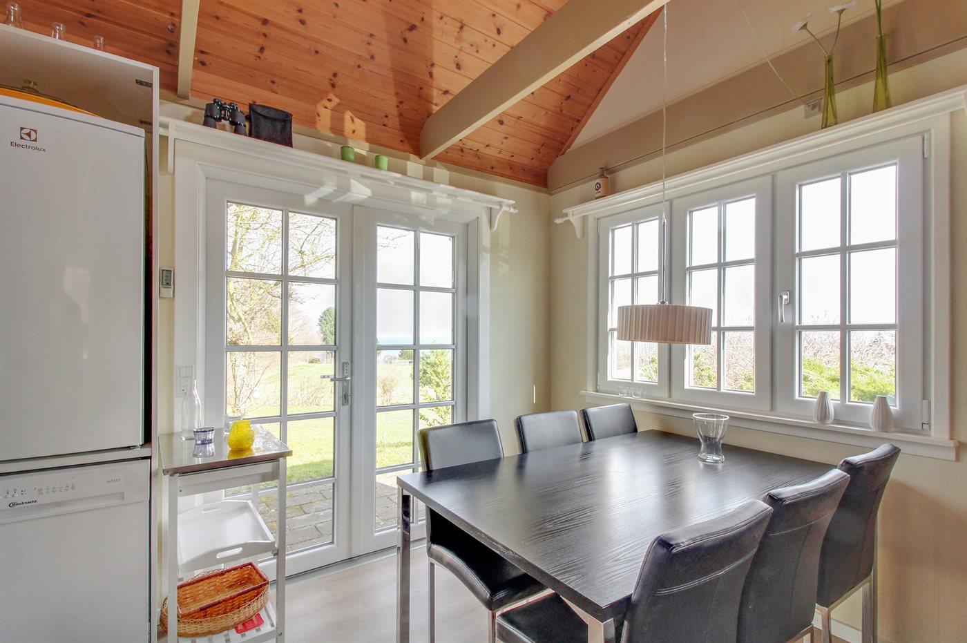 Flot træsommerhus med panoramaudsigt over Østersøen og hyggelig have i Sandkås.