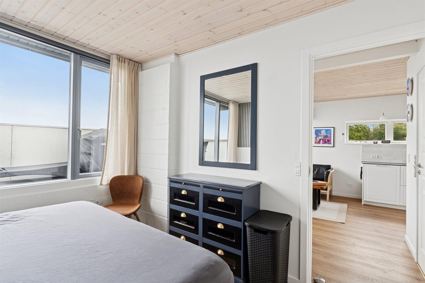 Det store panoramavinduesparti giver et fint lysindfald og sammen med det lyse interiør og den gode møblering er der skabt en god atmosfære. Der findes behagelige senge og et velfungerende, lyst badeværelse.