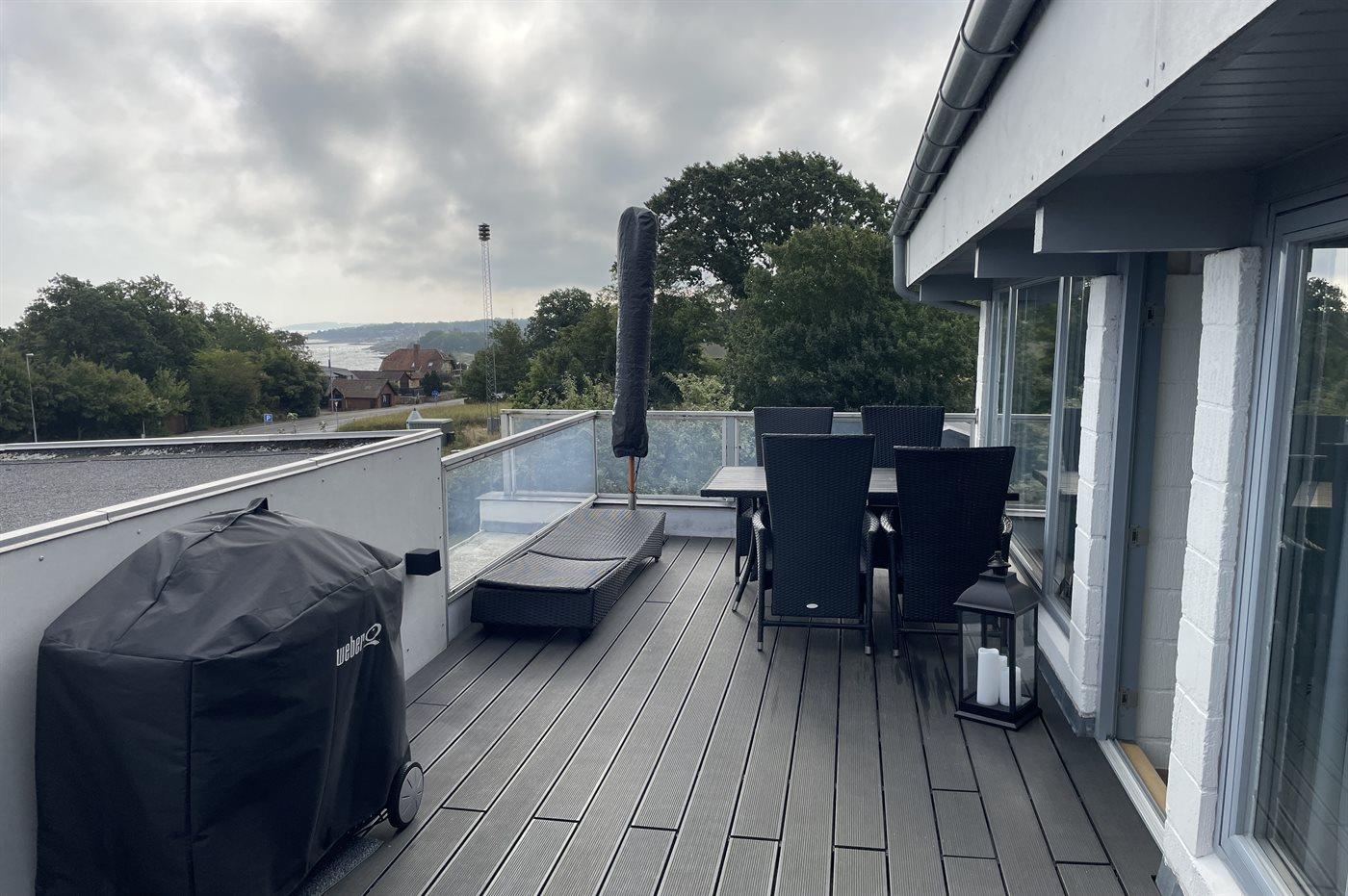 En ferielejlighed i en rækkebebyggelse med en fantastisk udsigt ud over vandet, både fra terrassen, som ligger ganske ugenert, og fra lejligheden.