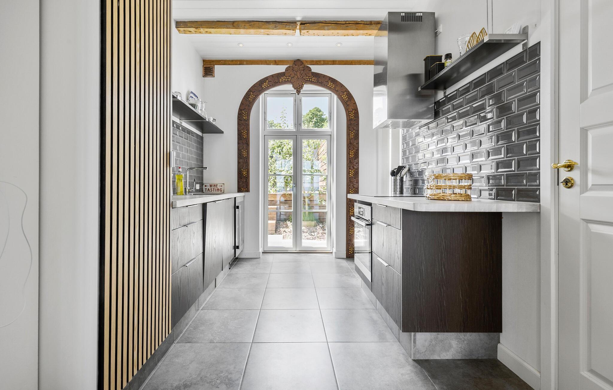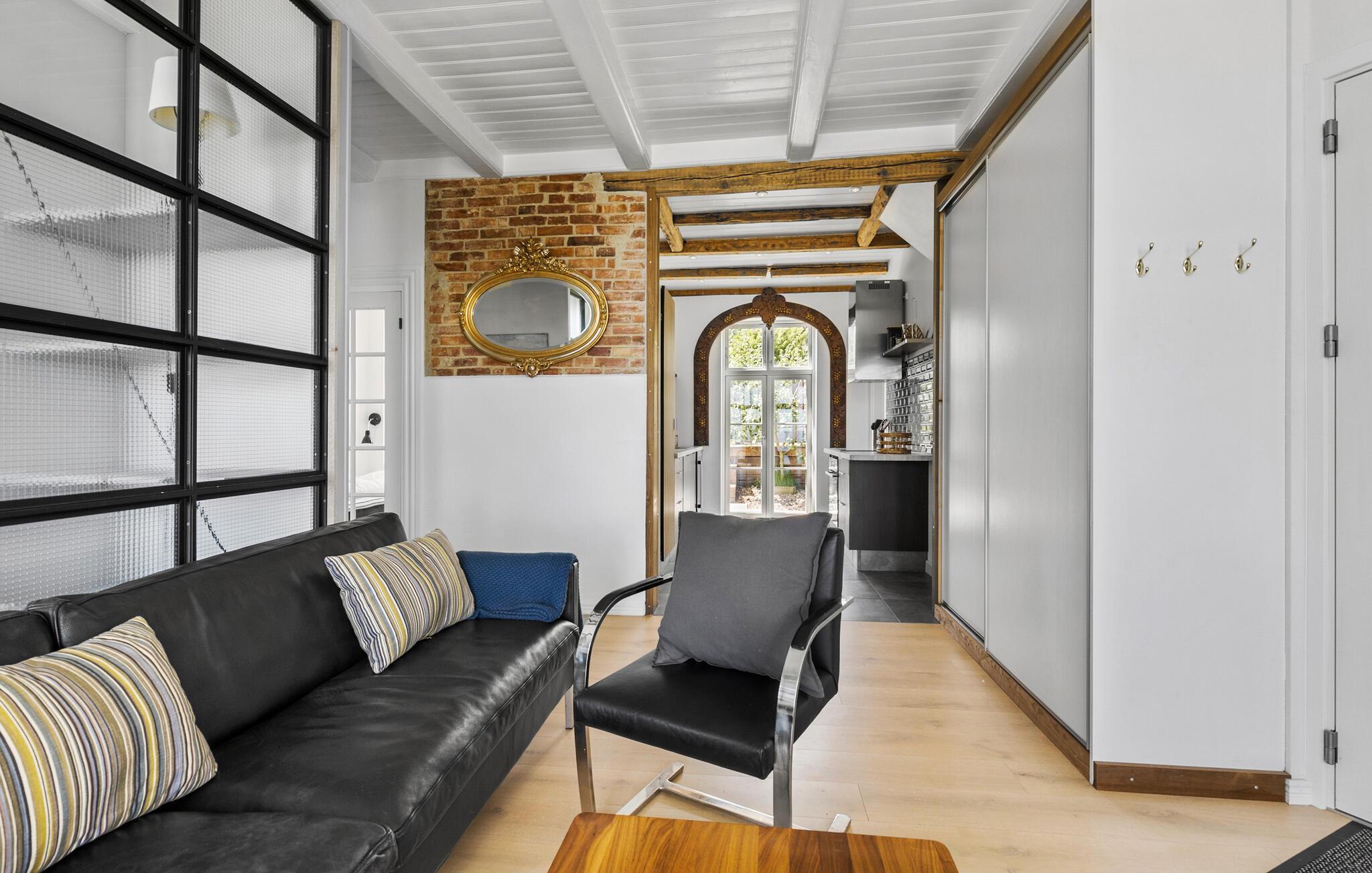 Lejligheden er moderne indrettet og har gulvvarme overalt, hvilket giver et behageligt indeklima. Der er desuden lagt vægt på smart design og charmende finesser som bjælkerne under loftet, store lysindfald og pæne klinkegulve. Som familie eller to par kan I se frem til et integreret opholdsrum med køkken og spisestue samt to soveværelser.