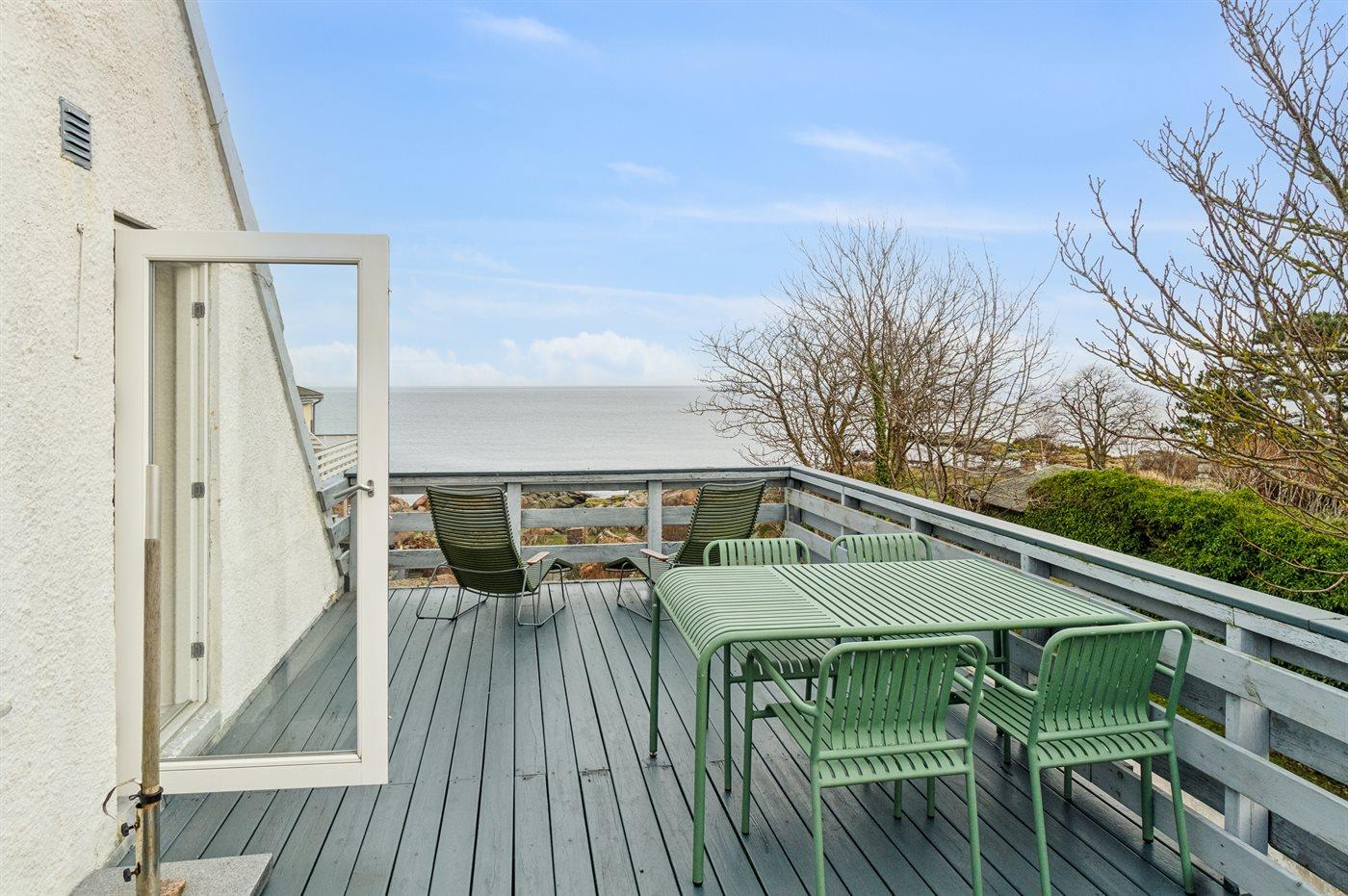 Til ferieboligen hører en stor, skøn tagterrasse med udsigt over havet og solnedgangen om sommeren.