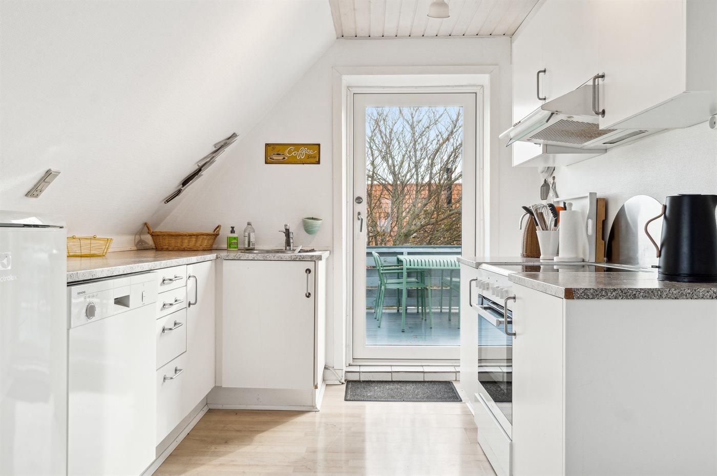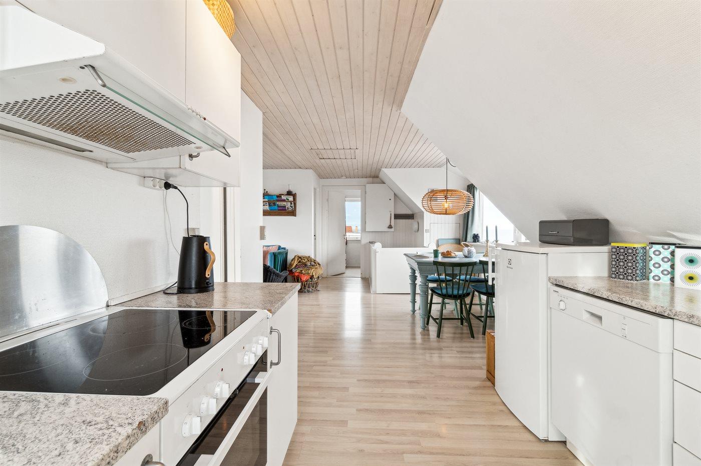 Køkkenet er udstyret med 1 køleskab. Der er 4 keramiske kogeplader, varmluftovn samt opvaskemaskine.