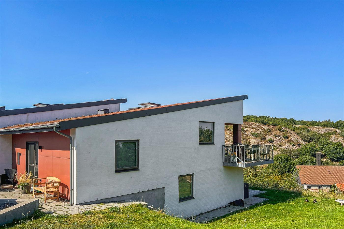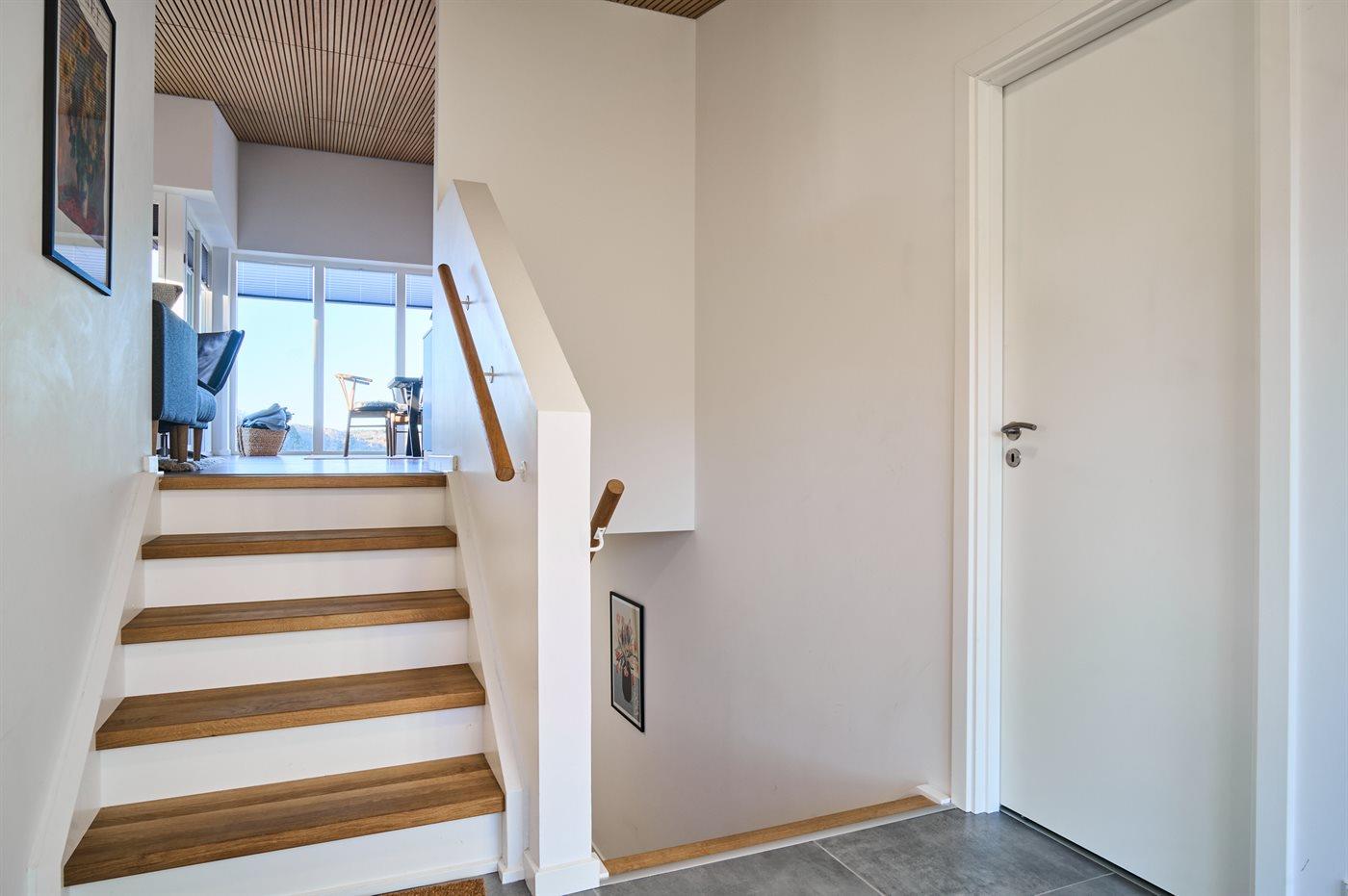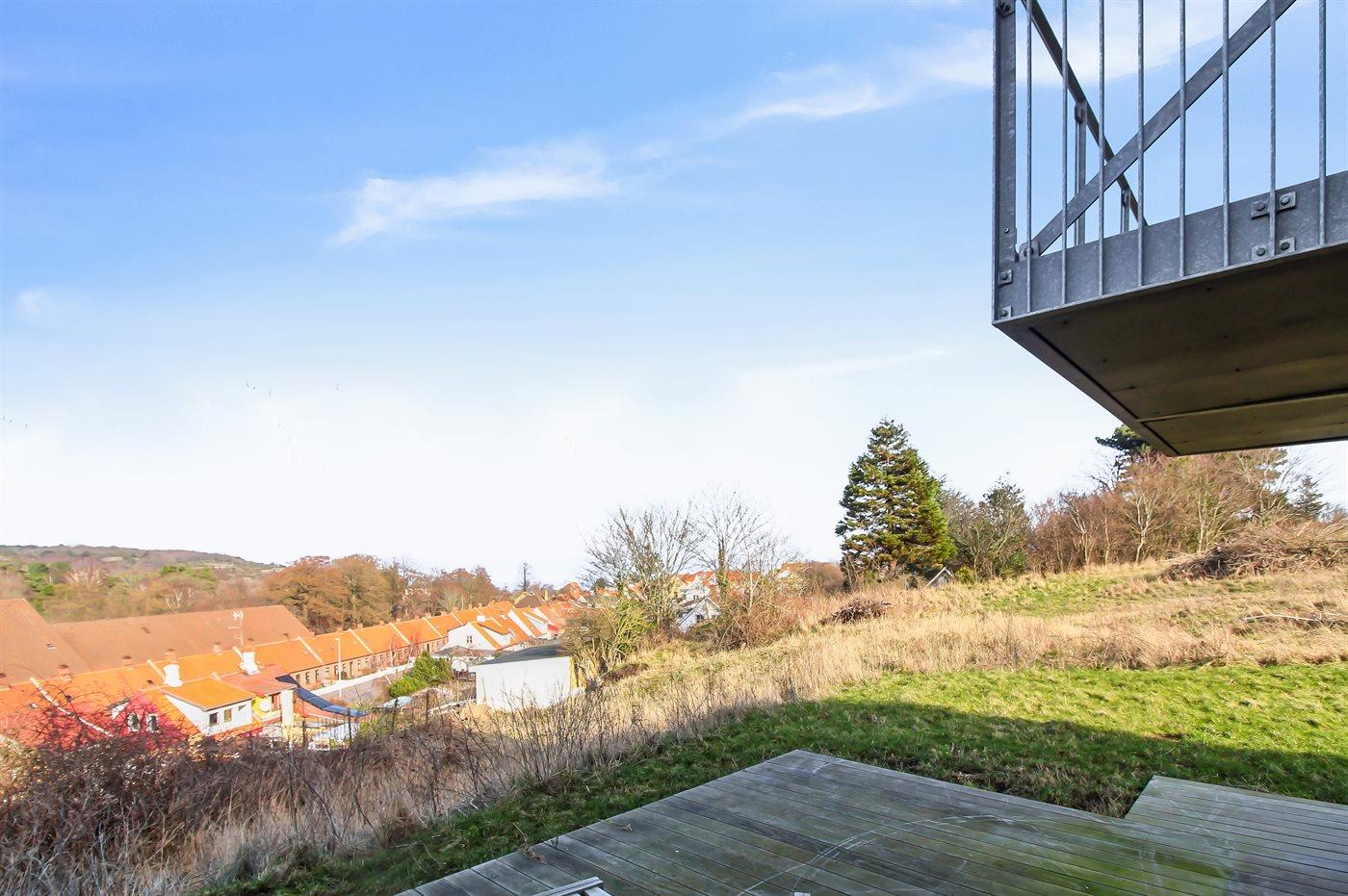 Huset er bygget på en skrånende grund, og når man kommer ind i huset og går ned, er man alligevel i niveau med den hævede terrasse, og går man op, har man mulighed for at gå ud på den overdækkede terrasse. Der er fantastisk udsigt fra begge terrasser. Morgenkaffen kan med fordel tages på terrassen ved indgangspartiet.