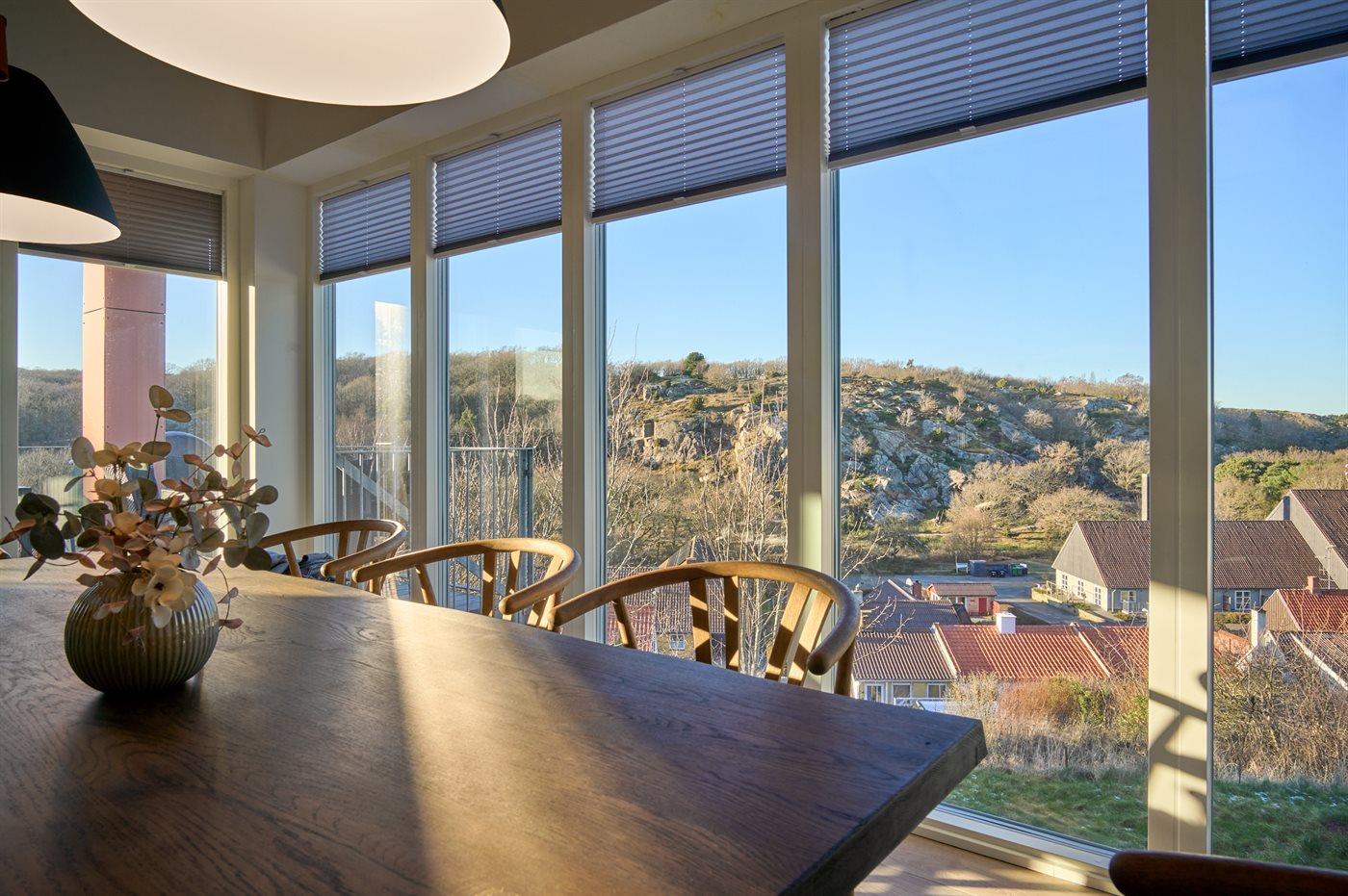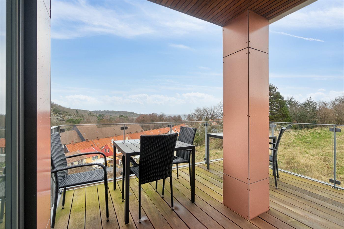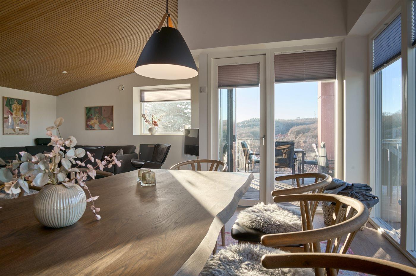Huset er bygget på en skrånende grund, og når man kommer ind i huset og går ned, er man alligevel i niveau med den hævede terrasse, og går man op, har man mulighed for at gå ud på den overdækkede terrasse. Der er fantastisk udsigt fra begge terrasser. Morgenkaffen kan med fordel tages på terrassen ved indgangspartiet.