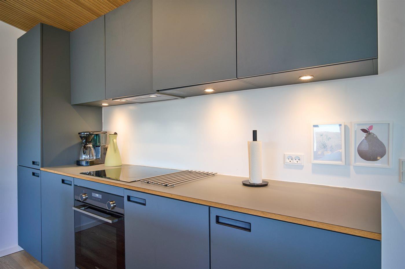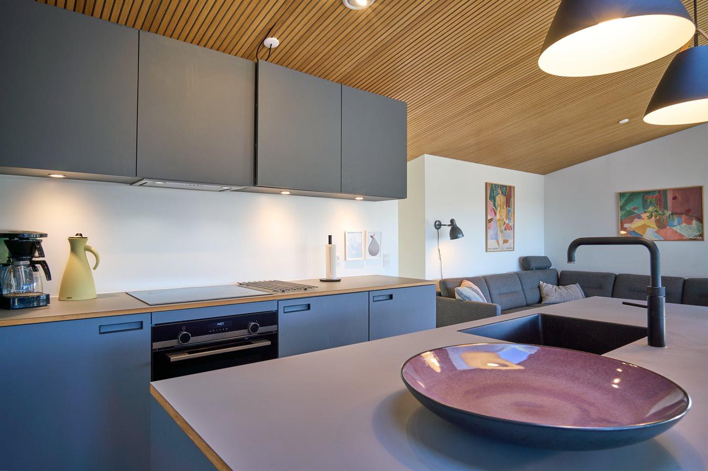 Køkkenet er udstyret med 1 køleskab. Der er 4 induktionskogeplader, varmluftovn samt opvaskemaskine.