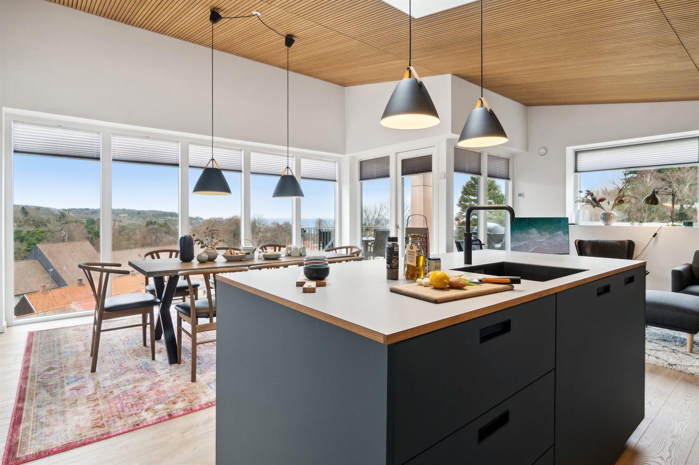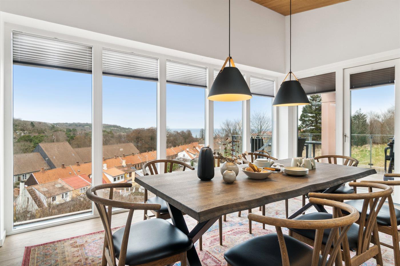 Moderne feriehus med panoramaudsigt over Hammerknuden og Sandvigbugten, bygget i bæredygtige materialer i 2023.