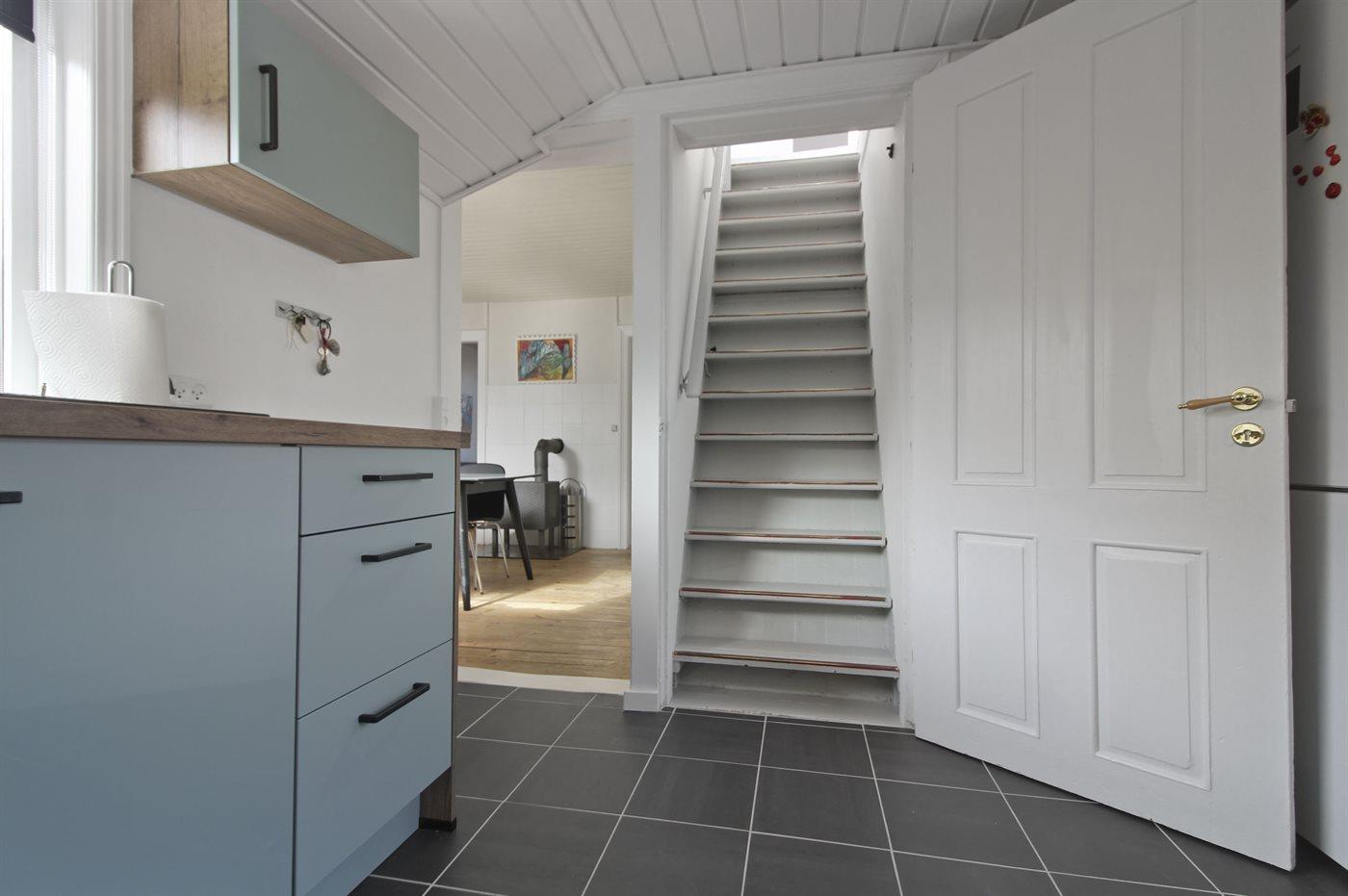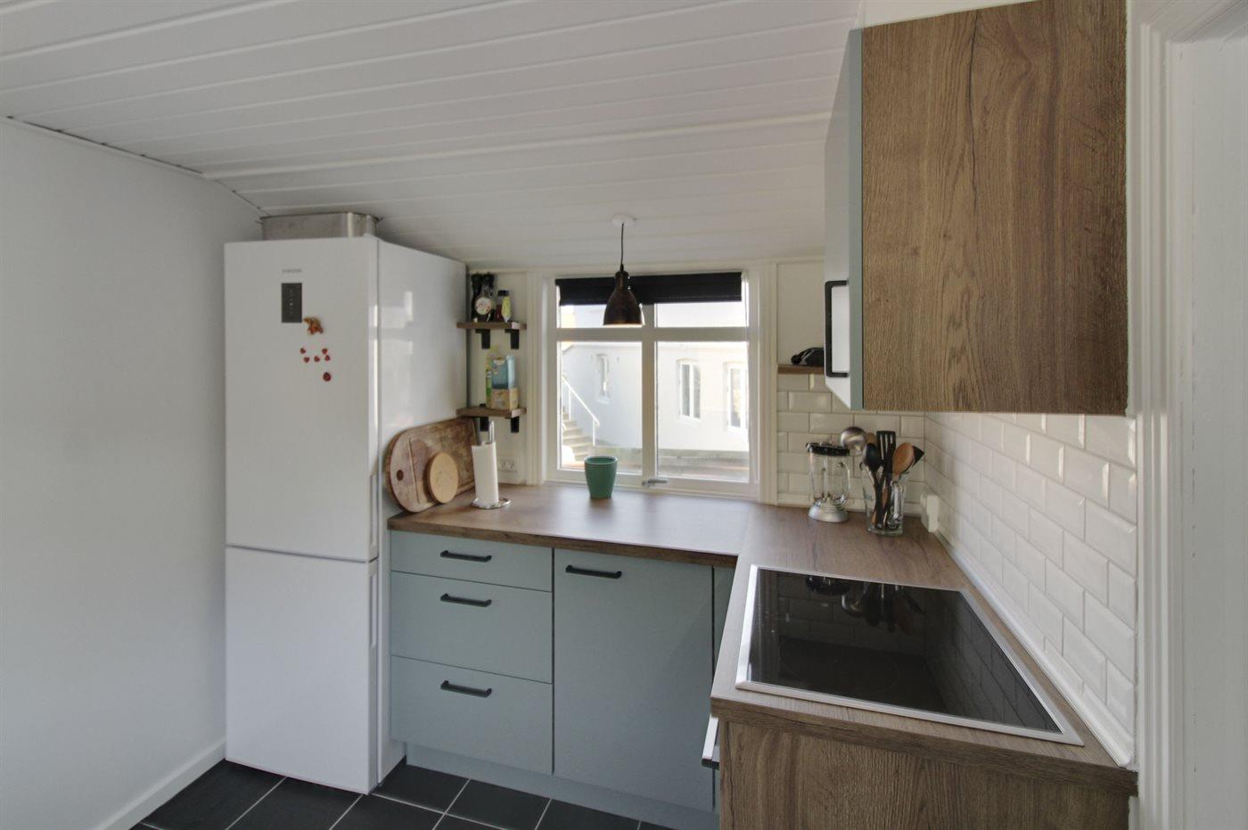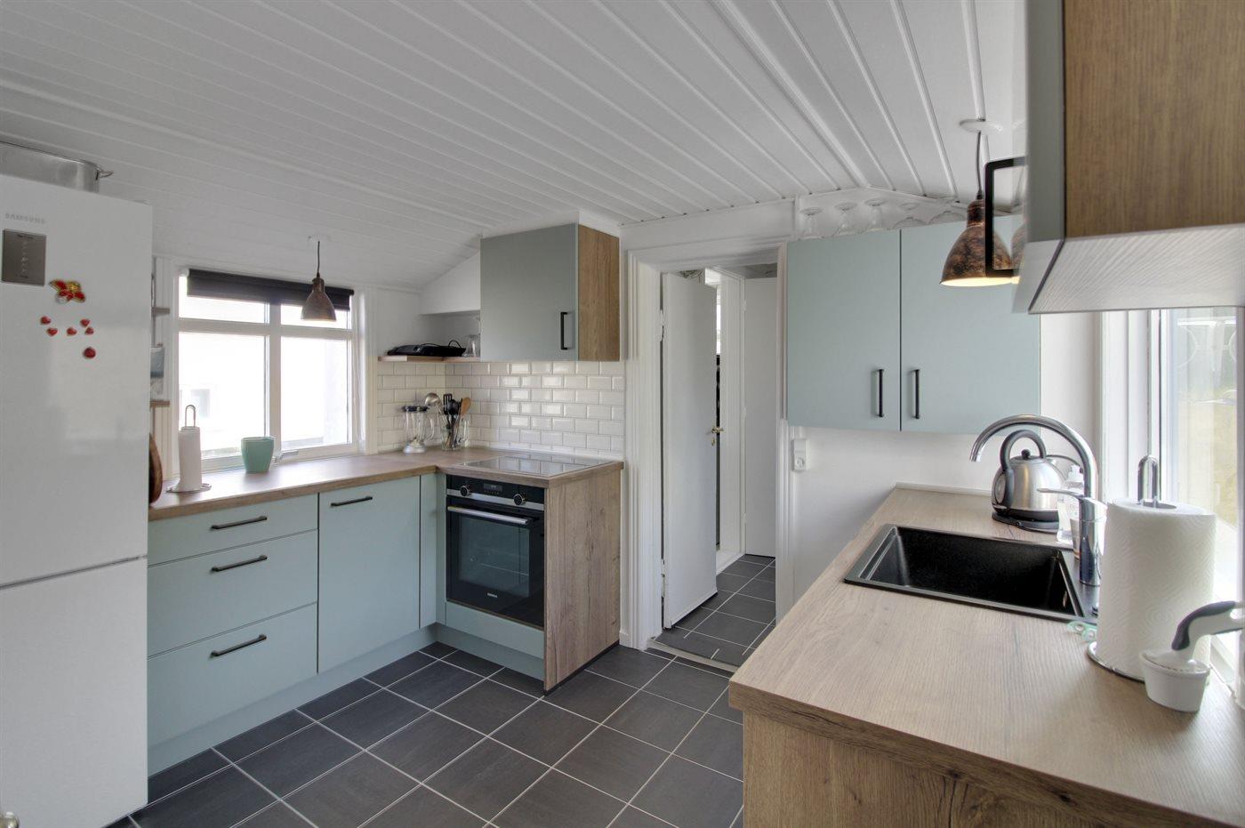 Køkkenet er udstyret med 1 køleskab. Der er 4 keramiske kogeplader, varmluftovn, mikrobølgeovn samt opvaskemaskine.