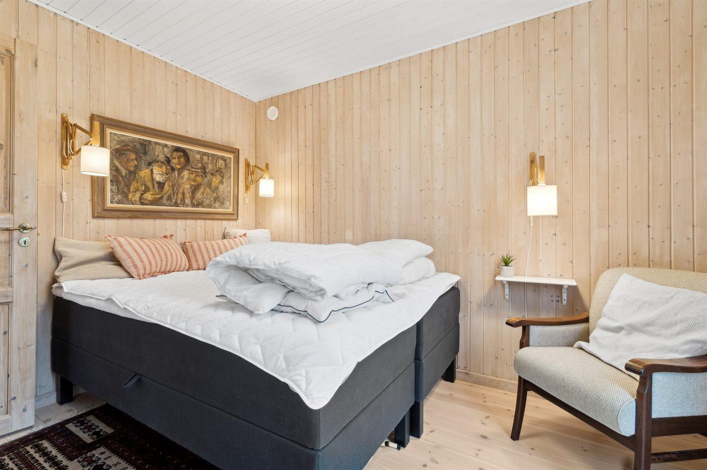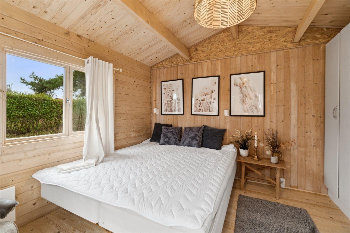 Sovepladserne fordeler sig på ét værelse med dobbeltseng i hovedhuset, én dobbelt sovesofa i opholdsstuen samt to annekser, hvoraf det ene er indrettet med dobbeltseng og det andet med 2 enkeltsenge. Hovedhus og annekser er naturligt bundet sammen af den store terrasse og terrassedøre, der sikrer, at man frit kan bevæge sig rundt.