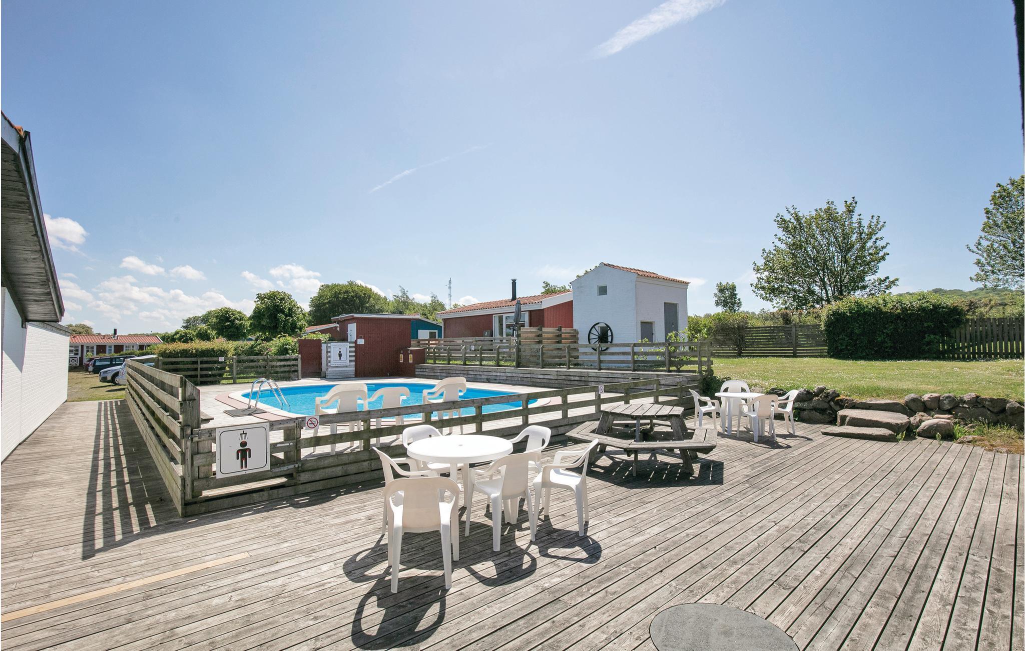Flot renoveret ferielejlighed i den gule ejendom "Skagenhuset" beliggende nær flot klippekyst og med fælles udendørs swimmingpool (opvarmet ca. 10.juni - 5. sept.) samt fælles legeplads og boldbane, altsammen i et skønt og børnevenligt område. Lejligheden fremtræder lys og pænt indrettet med komfortable møbler, et godt åbent køkken med opvaskemaskine og et nydeligt lyst badeværelse. Her er naturligvis gratis trådløst internet til rådighed. Dejlig terrasse med havemøbler og grill i et hyggeligt område. Godt nærmiljø med klippepartier og flotte fællesarealer i område med flere huse og lejligheder kaldet "Madseløkke", ligesom I også har adgang til fælles vaskeri (mod betaling). Fra lejligheden, der er nabo til lejlighederne I56151 og I56153, er der ikke langt til den smukke klippekyst, cykelsti til Sandvig og Allinge og nær til indkøbsmuligheder og restauranter samt badestrande i såvel Sandvig som Allinge. Lejligheden ligger i stueplan og er røgfri.