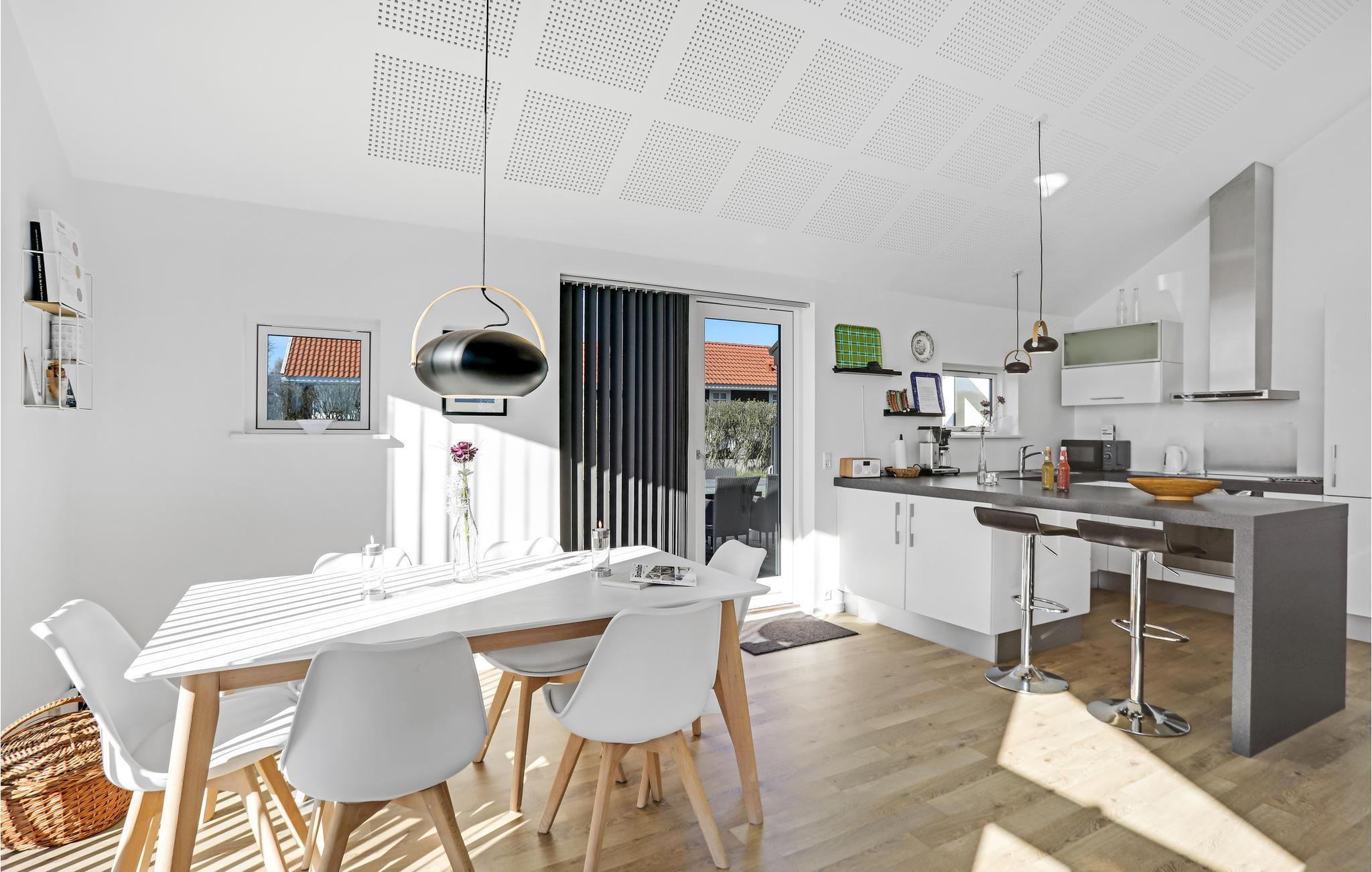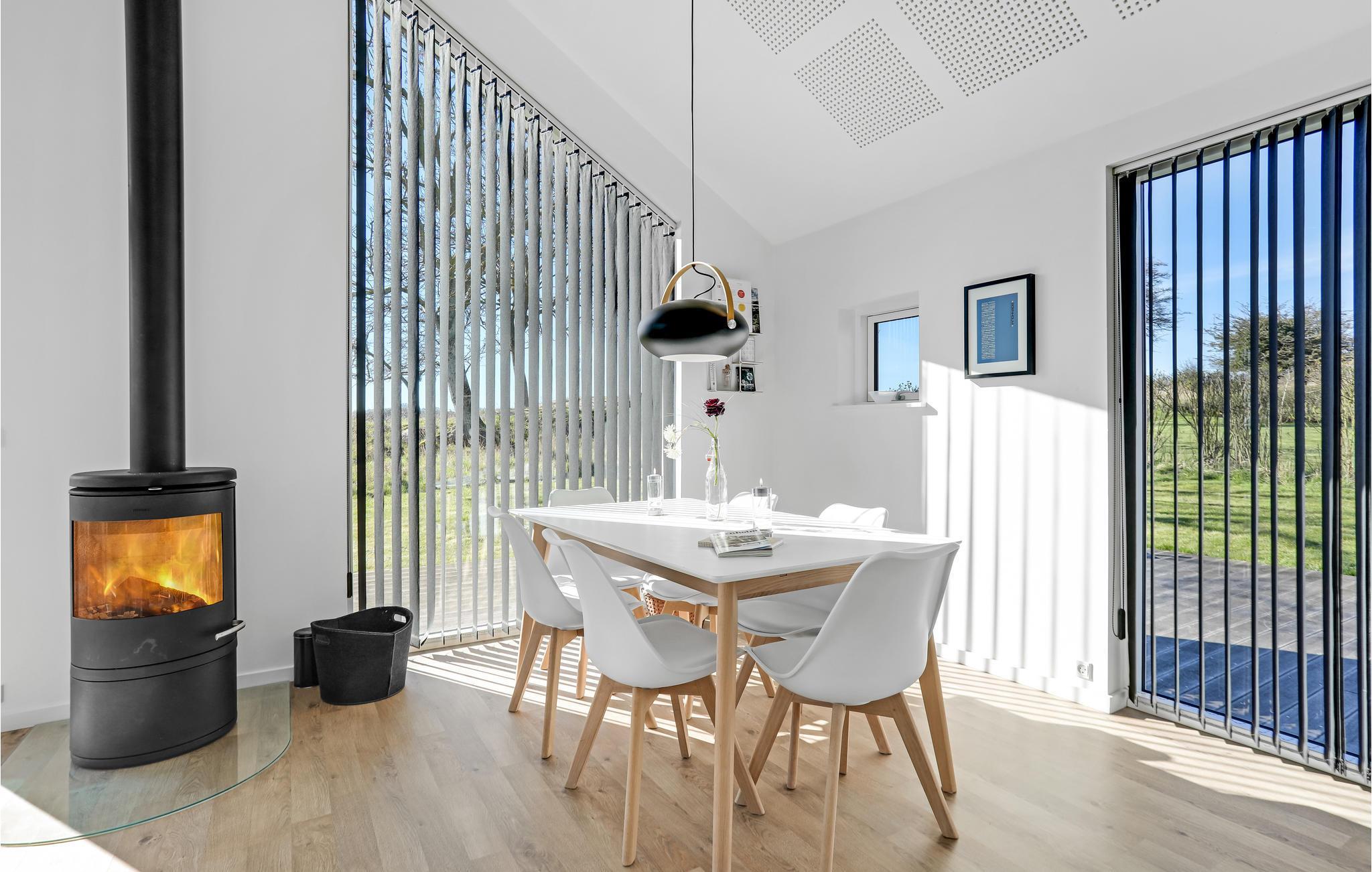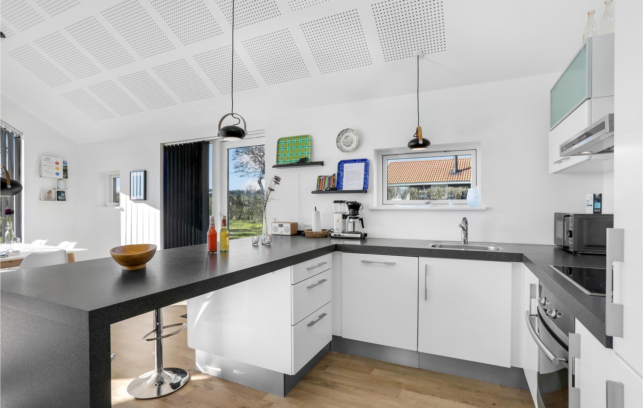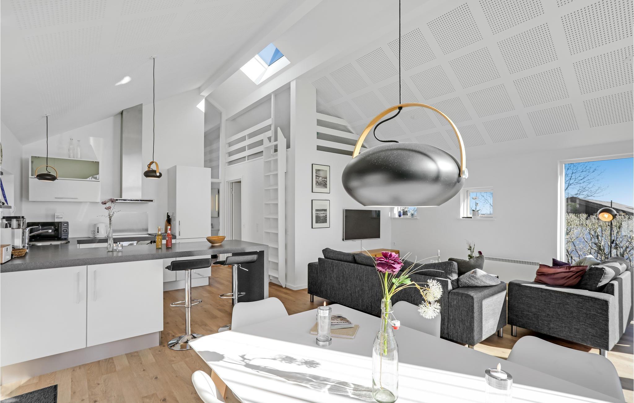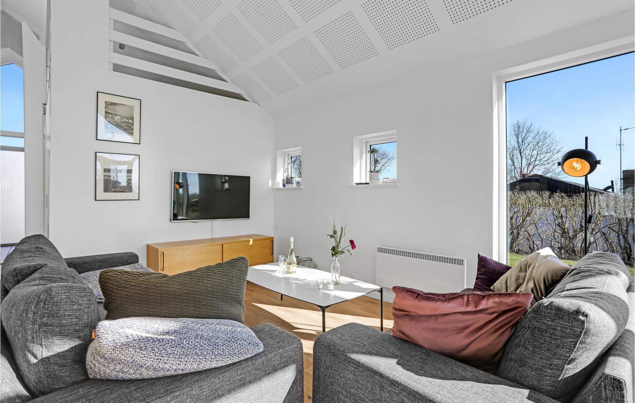 Huset er lyst og moderne indrettet. Åbent til kip skaber en rummelig og meget hyggelig atmosfære. Den dejlige opholdsstue er udstyret med komfortable møbler at flade ud i, en brændeovn til de køligere sæsoner, og fjernsyn med Apple TV til underholdning om aftenen og på regnfulde dage. Store glaspartier lukker meget lys ind og giver et dejligt udsyn til hav og grønne omgivelser. I det åbne og veludstyrede køkken er det nemt at tilberede lækre måltider. Der er gulvvarme på husets badedværelse.