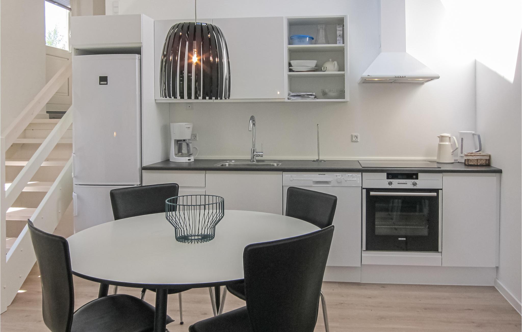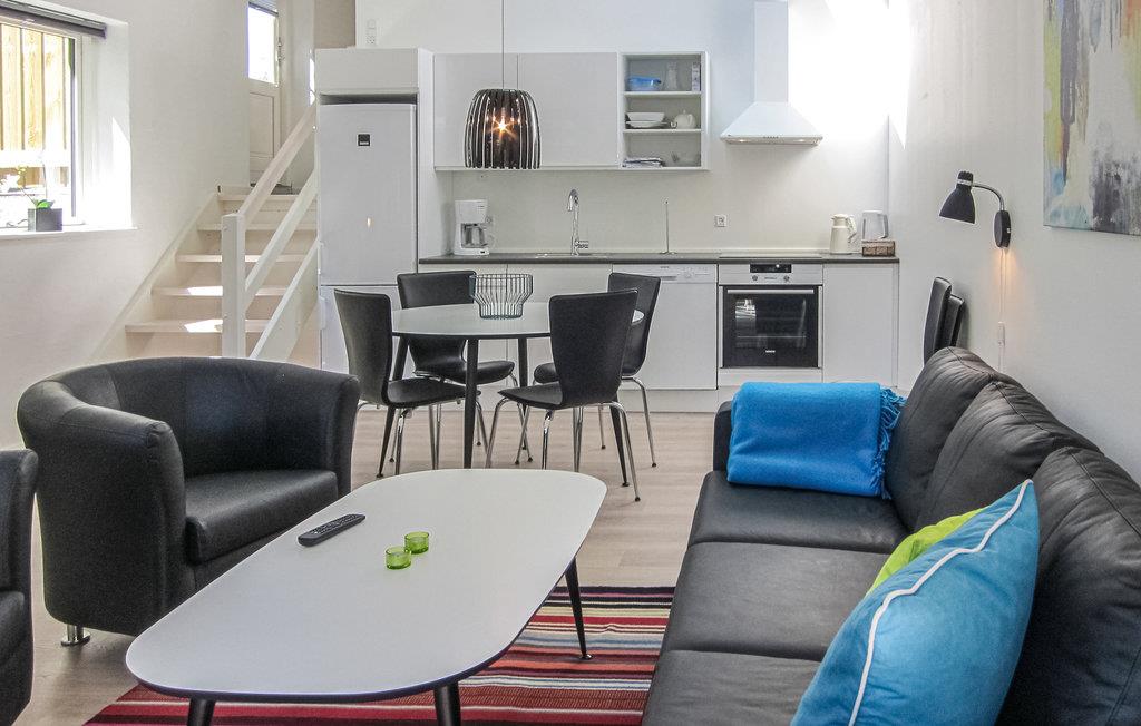 Lejlighedens hjerte er den kombinerede køkken og opholdsstue, hvor nogle af jer kan slappe af i komfortable møbler foran fjernsynet, mens andre laver mad. Fra stuen er der udgang til en terrasse med havemøbler og grill, hvor I kan nyde solen og den friske havluft og tilberede lækre grillretter. Der er behagelig gulvvarme samt vaskemaskine på badeværelset. På 1. sal finder I et stort soveværelse med fire gode senge opdelt af en skillevæg; bemærk, at der er begrænsdet loftshøjde i den ene halvdel af rummet.