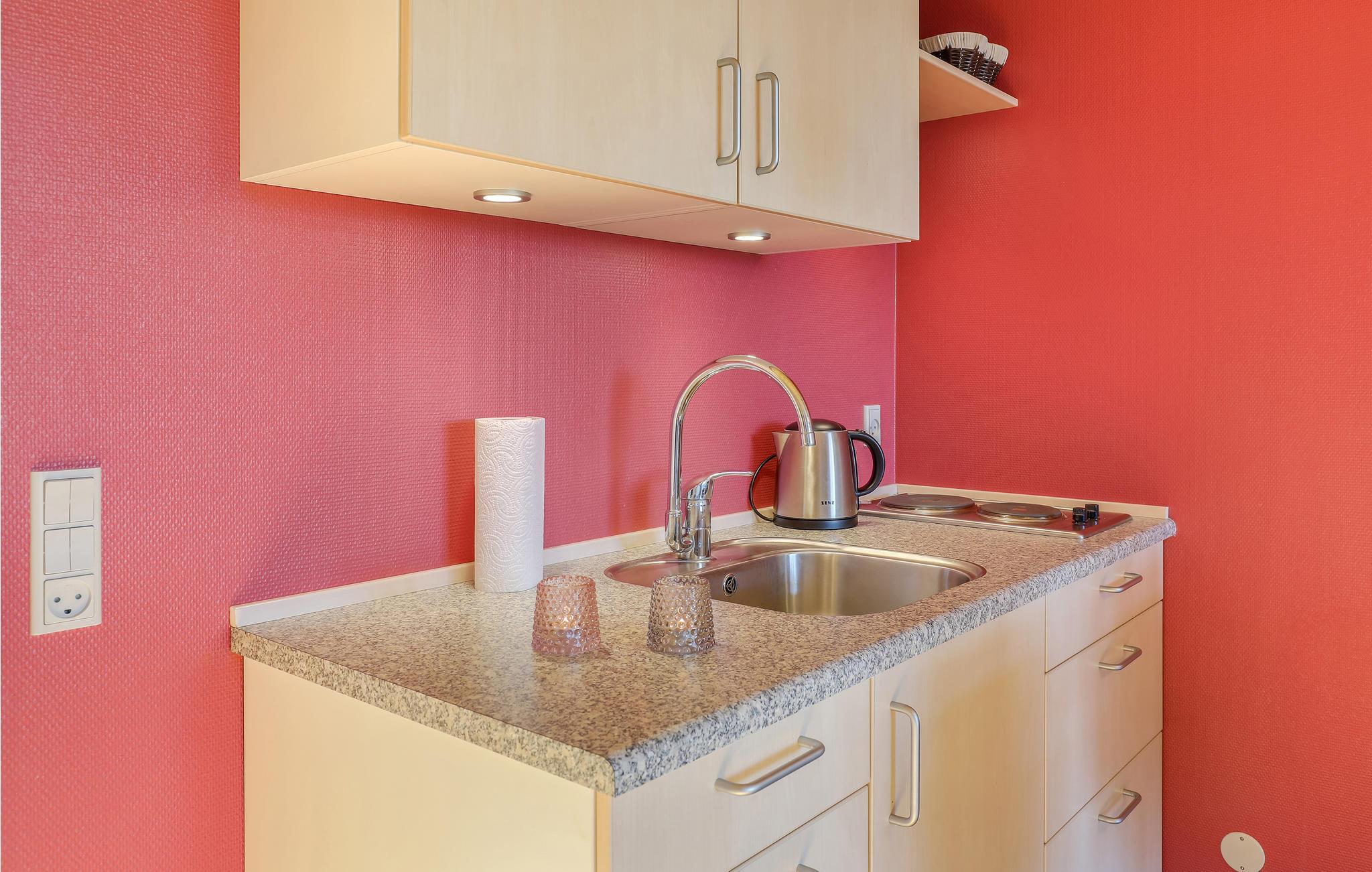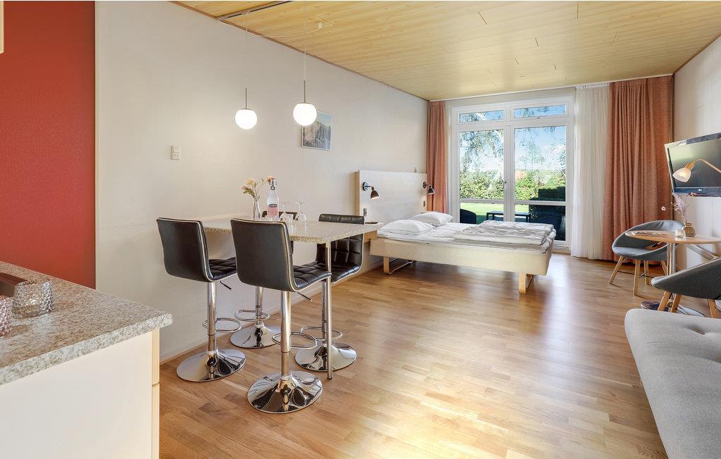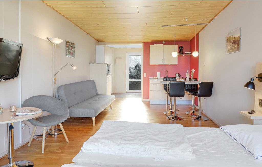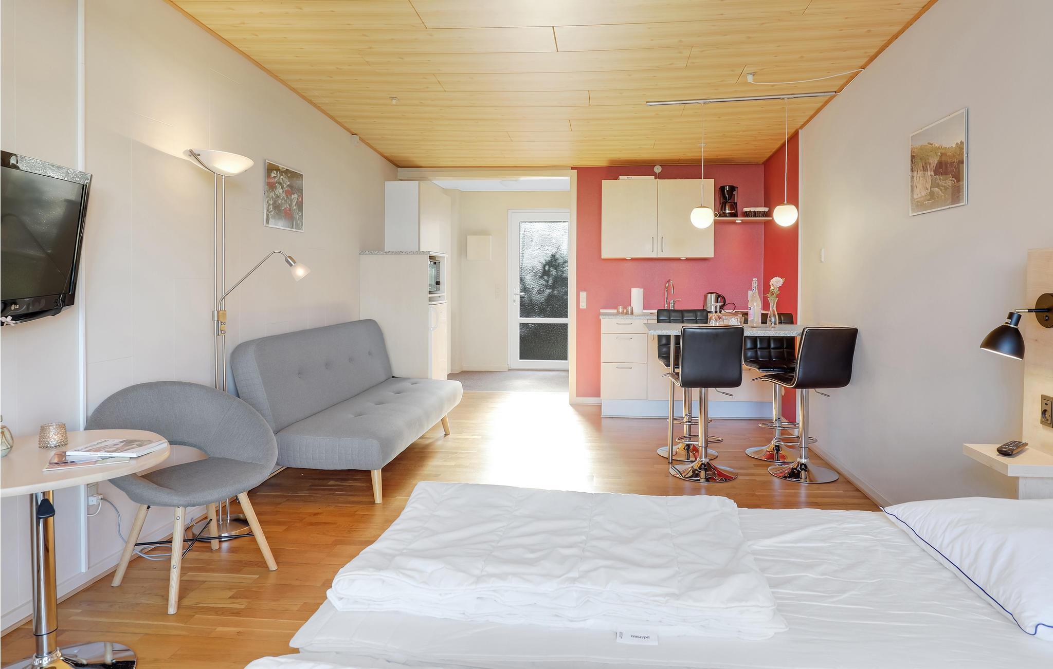I kommer til at bo i en hyggelig, aflang etværelseslejlighed, som er lyst og moderne indrettet. Rummet er fint inddelt i små sektioner, så I har dobbeltsengen i den ene ende, mens den anden halvdel består af et åbent køkken med en lille spiseplads. Midtfor står der desuden en behagelig sovesofa, så her er plads til tre personer i alt.