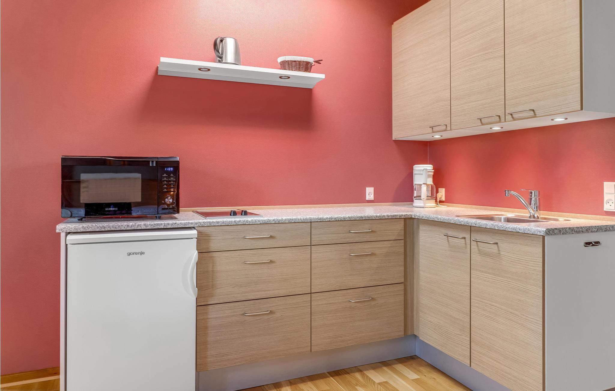 I kommer til at bo i en rummelig etværelseslejlighed, som er lyst og komfortabelt indrettet. Rummet er fint inddelt i små sektioner, så I har dobbeltsengen i den ene del samt et køkkenhjørne med spiseplads og en krog med bløde møbler, hvor I kan slappe af om aftenen. På sovesofaen kan I også rede op til en tredje gæst.
