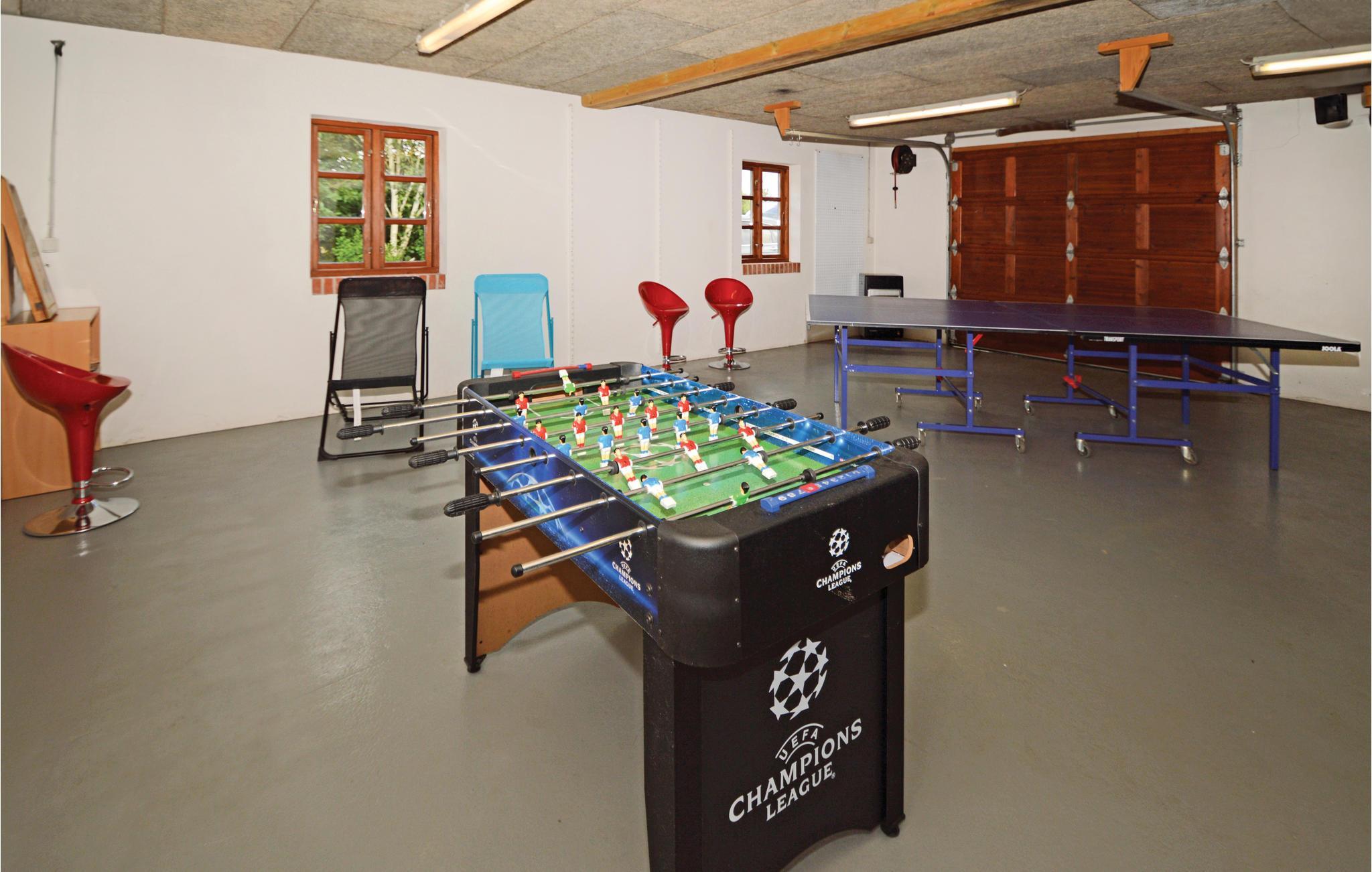 Gården er yderst smagfuldt indrettet, her er ikke gået på kompromis med kvaliteten. Fra det store køkken, der er åbent mod stuen, med et rummeligt spiseområde samt brændeovn, er der direkte udgang til en sydvestvendt flisebelagt terrasse. I huset findes desuden to badeværelser med et spabad i det ene. I det 97 m2 store aktivitetshus finder I blandt andet basketball, bordtennis, boksebold og dart. Her er der rig lejlighed til at både store og små kan have det hyggelig og sjovt sammen.