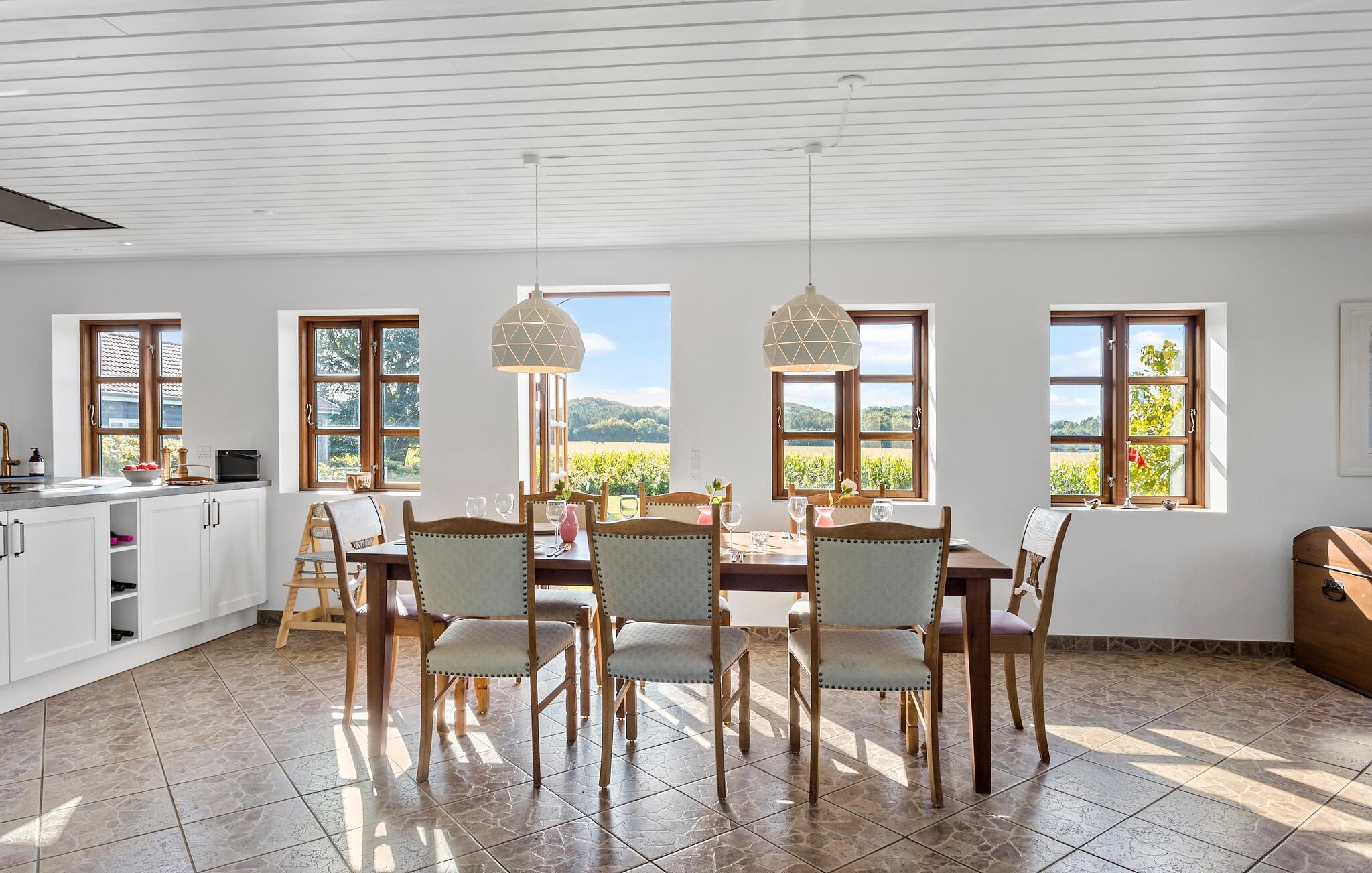 På en lun dag kan I tænde op i grillen og sætte jer ud på terrassen, som er flot indrammet af den grønne have. Den store naturgrund med græs og frugttræer deler I med rådyr og dådyr fra området.