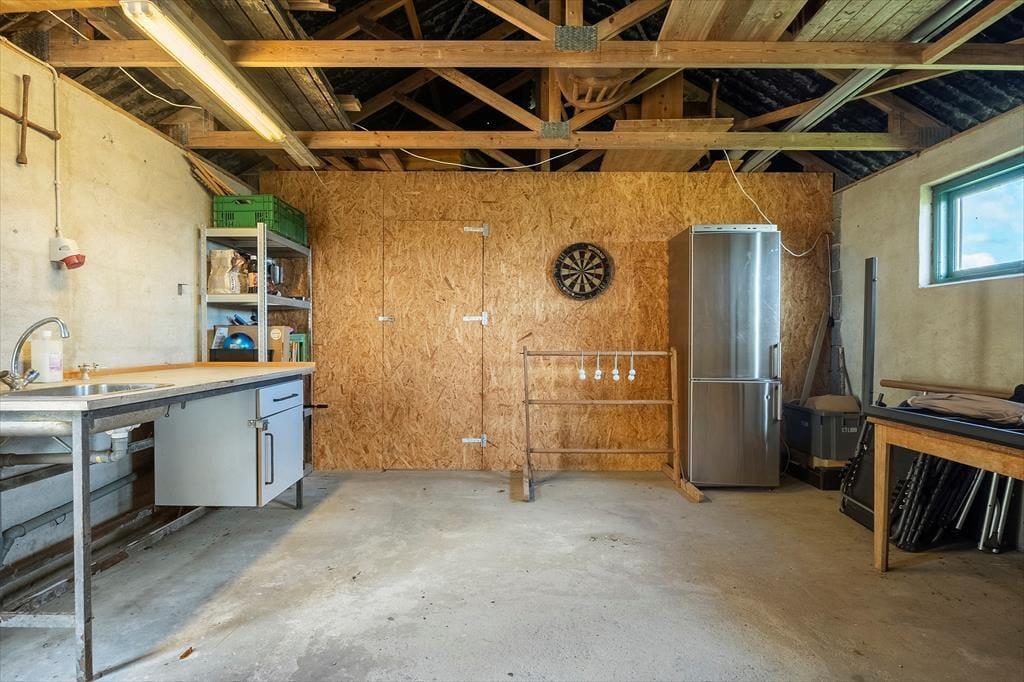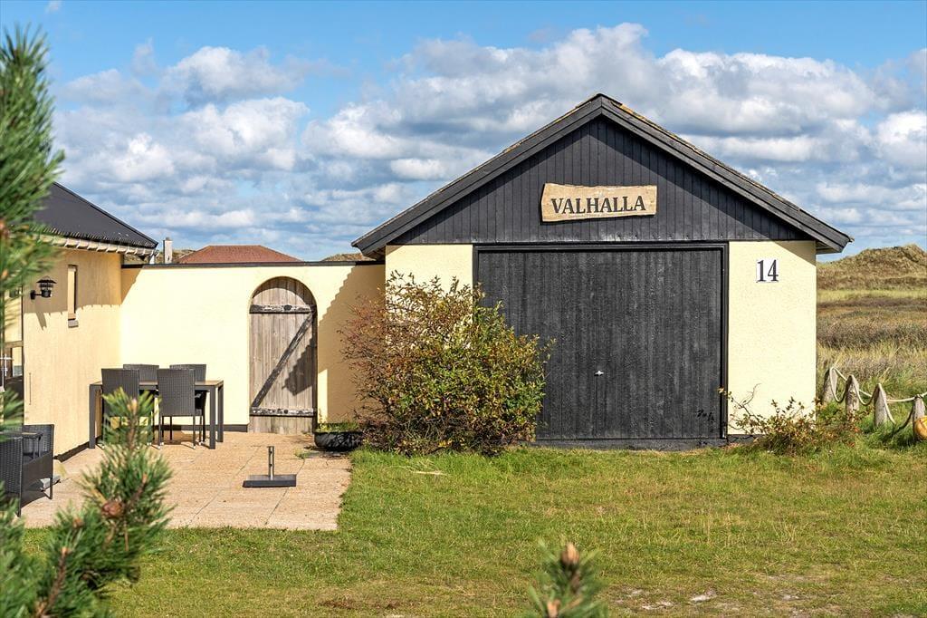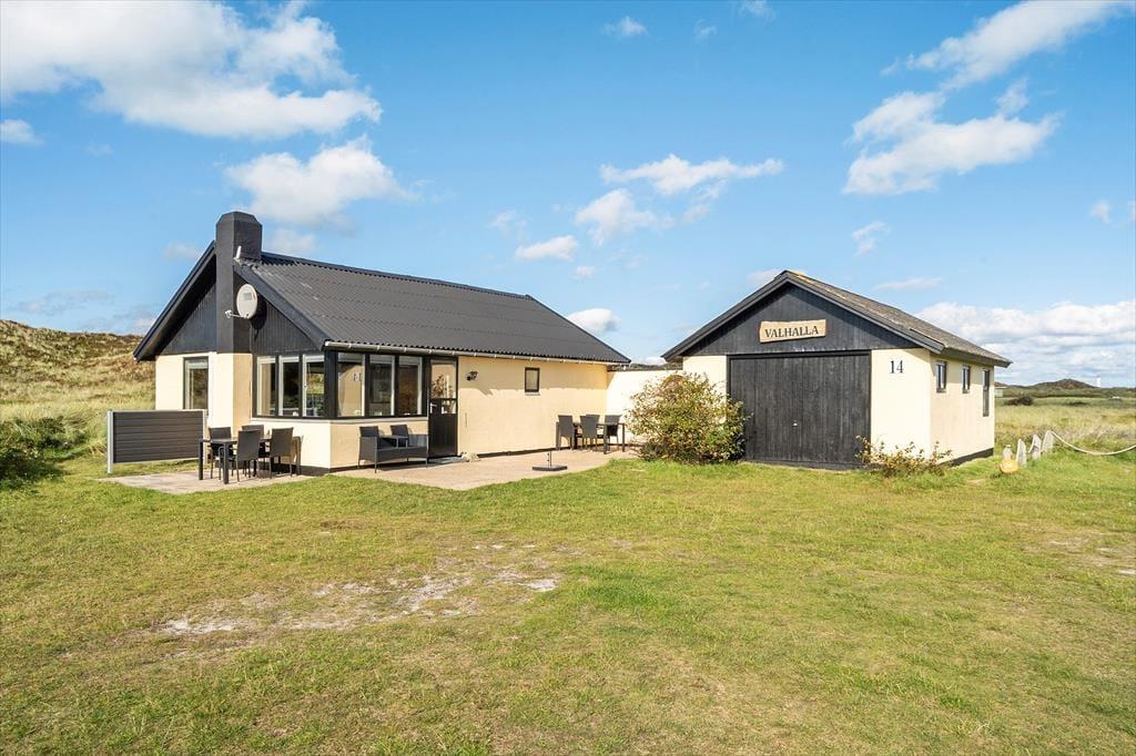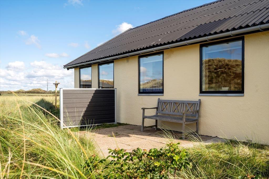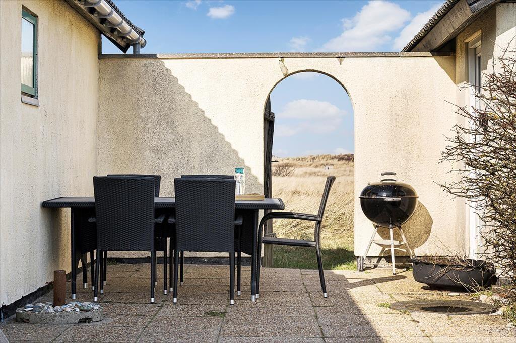 De naturskønne omgivelser kan I også nyde under åben himmel, for sommerhuset er omkranset af terrasser, masser af plads og rigtig god afstand til naboerne. Her er en fantastisk ro, som kun forstyrres af fuglenes sang og lyden af havets bølger, der slår mod stranden bag klitterne. Tag morgenkaffen med ud i dagens tidlige sol på den østvendte terrasse, hvorfra I har en langstrakt udsigt til klitheden, og hvor der er læ for vestenvinden. Udsigten kan også nydes fra den sydvendte terrasse, og på den vestvendte kan I sætte jer til rette og nyde dagens sene sol og solnedgangen bag klitterne. Den store naturgrund giver god plads til leg, drage-flyvning og boldspil. I udhuset er der plads til jeres medbragte cykler, lystfisker-grej og surfer udstyr, og her er et langt fiskerenserbord med vask, hvor man kan kan rense og klargøre sin fangst til aftensmaden. (Vandet her bliver dog lukket om vinteren). I udhuset findes havemøbler og hynder, liggestole og parasoller, som I nemt kan tage frem og nyde ferien i. Her er også en kul-grill, så I kan tilberede jeres friske fiskefangst til aftensmaden.