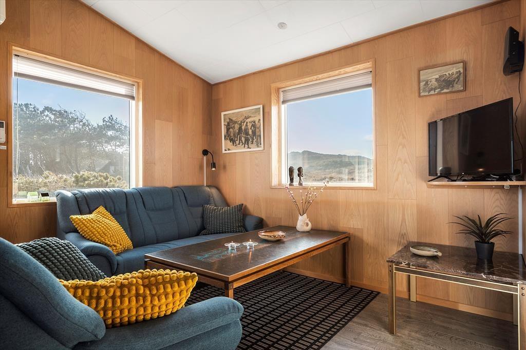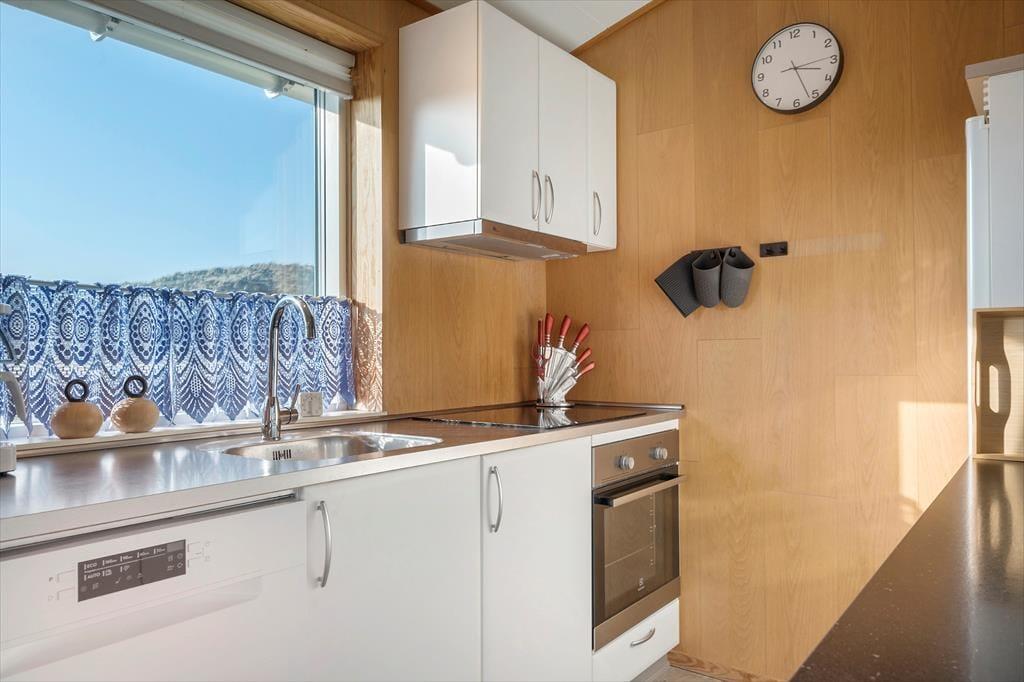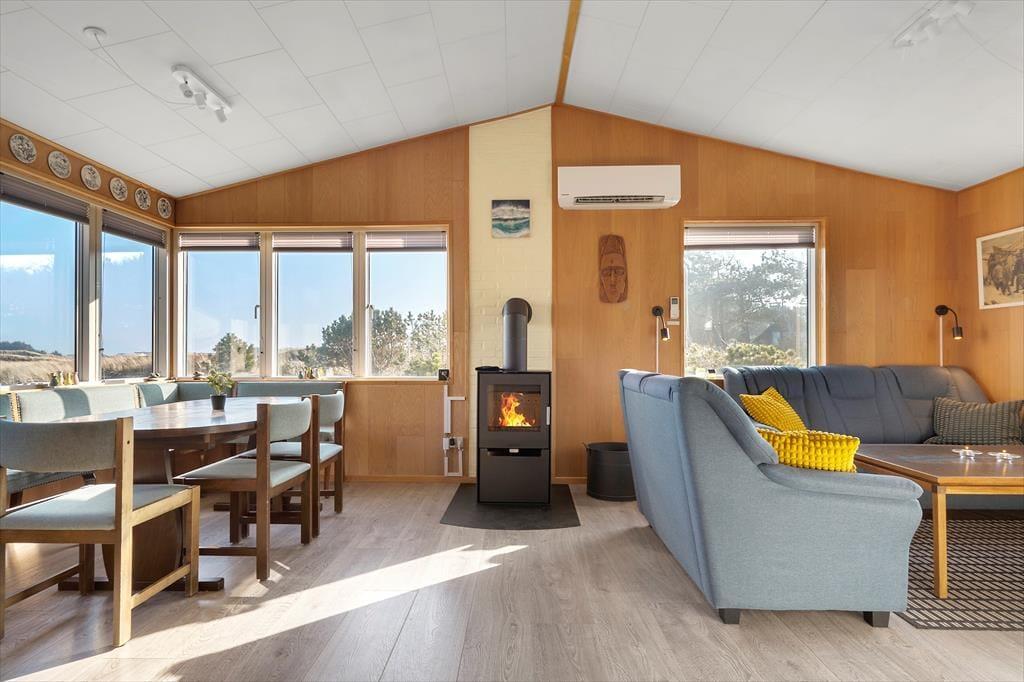 Huset er charmerende og hyggeligt indrettet, og i opholdsafdelingen ligger køkkenet og stuen i åben forbindelse. Køkkenet er moderne og veludstyret med blandt andet opvaskemaskine, og retterne serveres let ved spisebordet. Stuen byder også på et sofaarrangement, hvor I kan nyde hinandens selskab og samles om et brætspil, læse bøger eller se en god film. I kan også blot slappe af i de rolige omgivelser og nyde den fredelige atmosfære, mens varmepumpen holder en behagelig temperatur eller knitrende ild i brændeovnen spreder hyggen. Her er rig mulighed for at tilbringe kvalitetstid sammen i afslappende omgivelser.