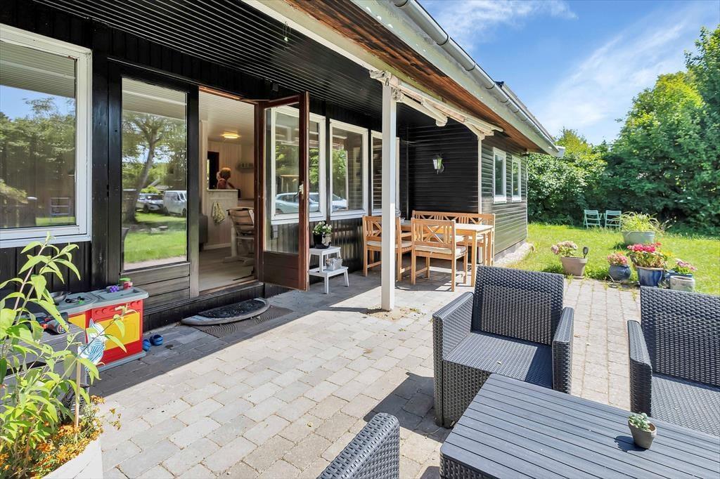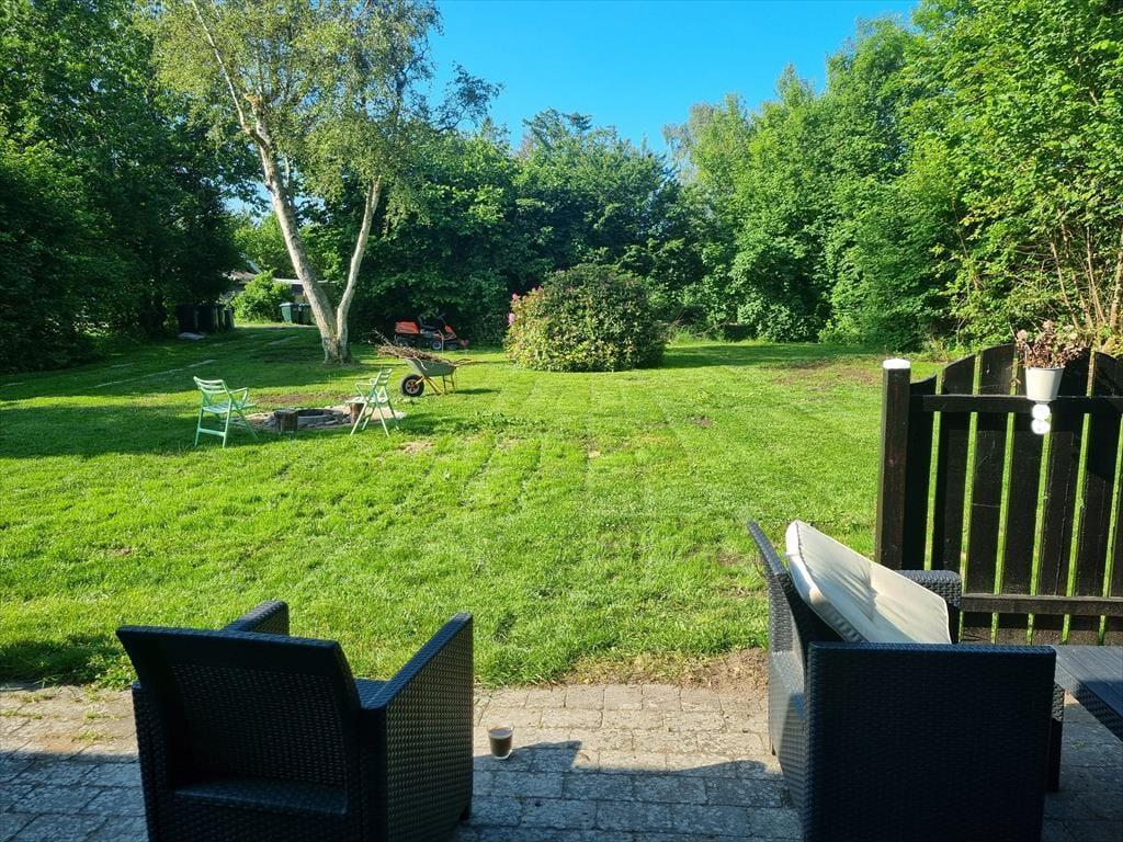 På den hyggelige terrasse kan du vælge enten at sidde i skygge og fordybe dig i en god roman under overdækningen eller flytte ud i det åbne areal og bare nyde solen fra morgen til aften eller slappe af i en af liggestolene. Børnene kan spille bold eller medbragte havespil.