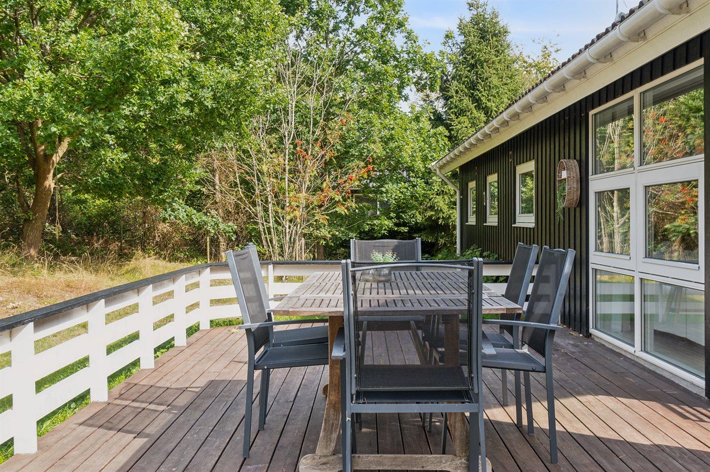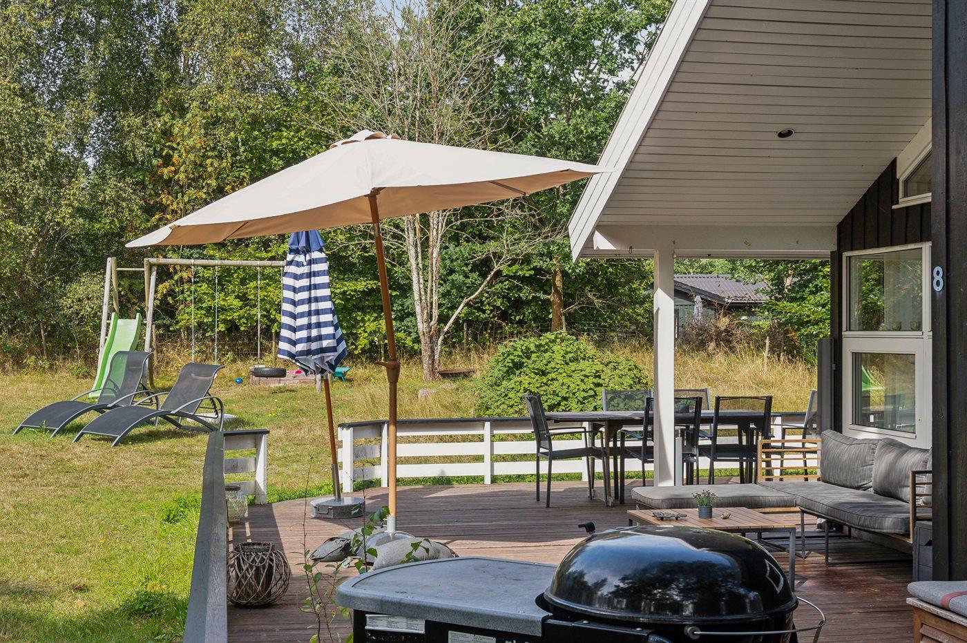 Ferieboligen er beliggende på en 1253 m² stor havegrund. Der er 1550 m til havet. Nærmeste forretning er beliggende i en afstand af 3100 m. Der er en golfbane i en afstand af 1600 m. Til ferieboligen hører 35 m² terrasseareal. Desuden er der 6 m² overdækket terrasse. Gynge. Trampolin. Rutchebane. Bålsted. Grill til rådighed. Parkering ved ferieboligen.