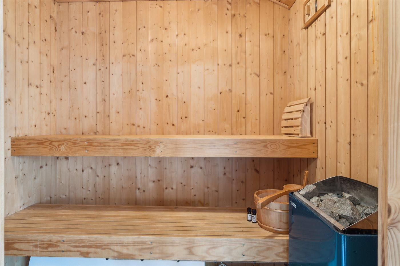Der er 1 badeværelse med bruseniche og 1 toilet.. Der er gulvvarme på 1 badeværelse. I saunaen er der mulighed for afslapning.