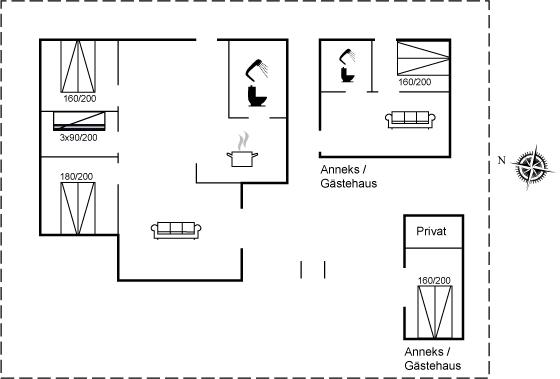Der er i alt 5 soveværelser. Sovepladserne fordeler sig på: 8 sovepladser i dobbeltsenge. 3 sovepladser i køjesenge. 4 af disse sovepladser fordeler sig på 2 annekser.