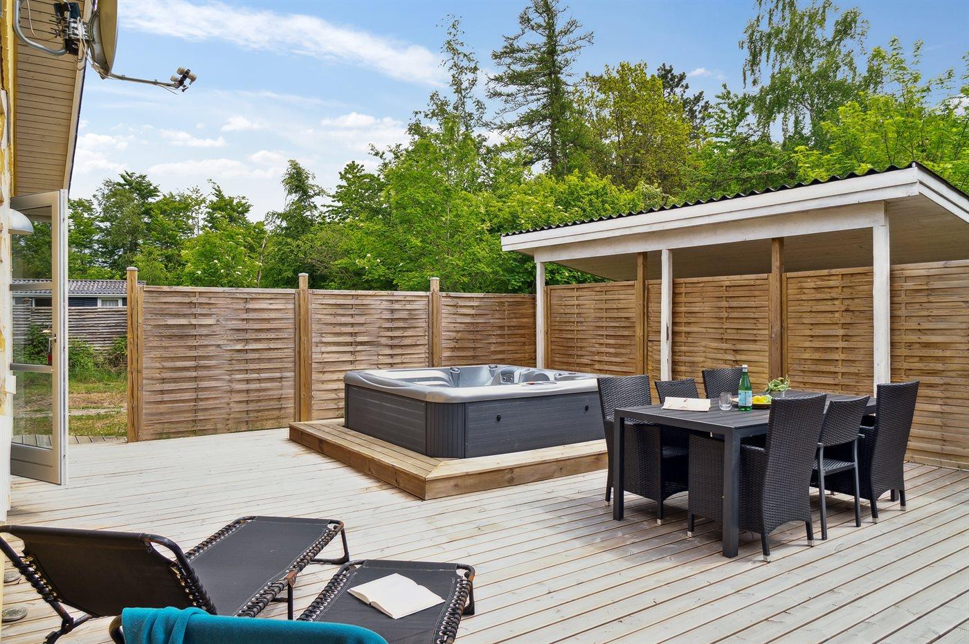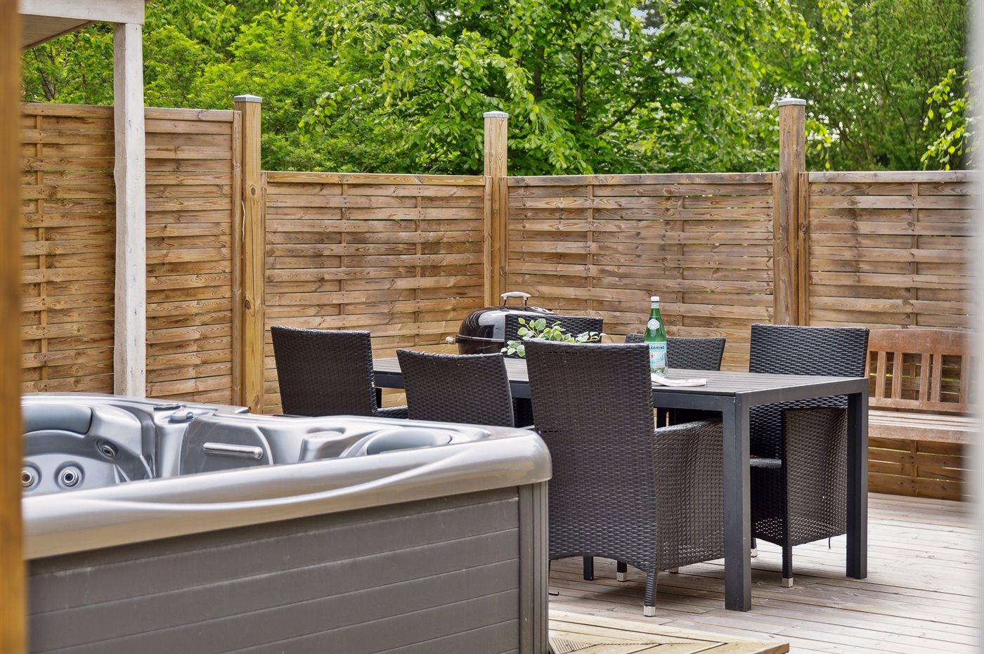På den sydvendte side af huset er en terrasse med udendørs spa og mod vest en overdækket terrasse, som der er udgang til fra køkkenalrummet. I haven er der gynge, rutsjebane og legetårn til børnene.
