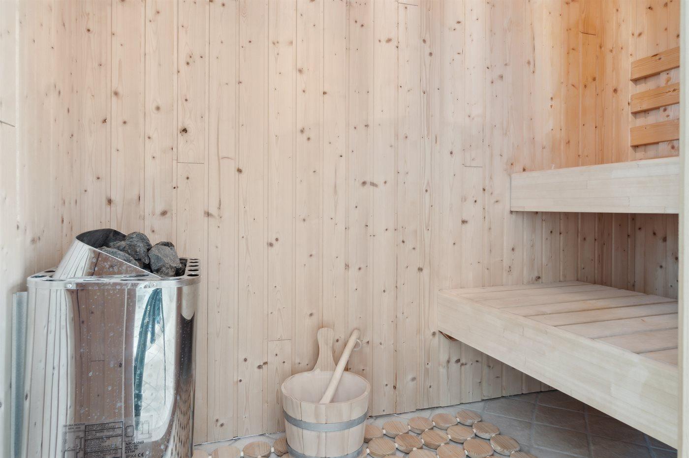 Der er 2 badeværelser med bruseniche og 2 toiletter. Der er gulvvarme på 2 badeværelser. I saunaen er der mulighed for afslapning.