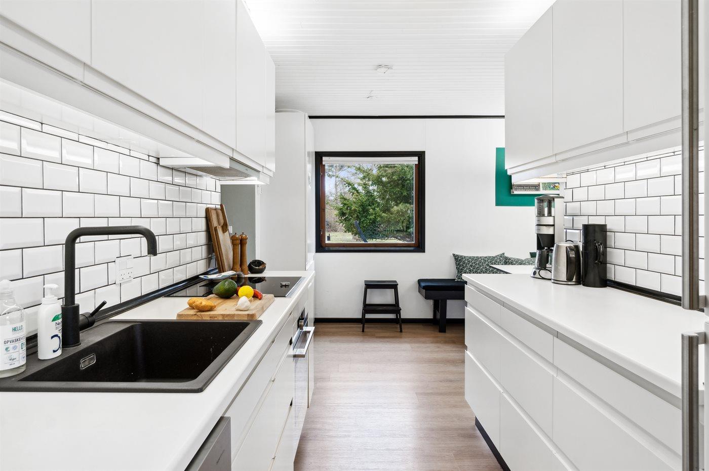 Køkkenet er udstyret med 1 køleskab. Der er 4 induktionskogeplader, varmluftovn samt opvaskemaskine.