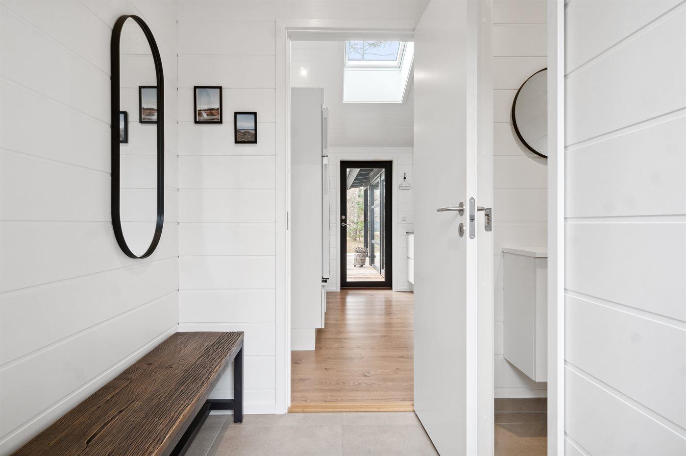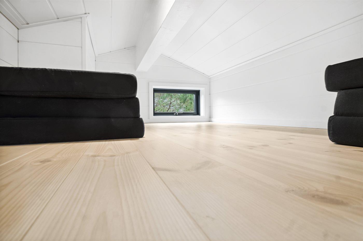 Der er 3 gode soveværelser med hver 2 sovepladser. Der er derudover 2 sovepladser på hemsen, som er bedst egnede til større børn. Der er mulighed for at tage madrasserne fra hemsen ned på gulvet i huset. Der er 1 badeværelse og 1 gæstetoilet, som begge har gulvvarme. Badeværelset har desuden bruseniche og sauna, og herfra er også udgang til udebruser. Huset opvarmes energivenligt med luft-til-luft varmepumpe, og der er ladestation til elbiler.