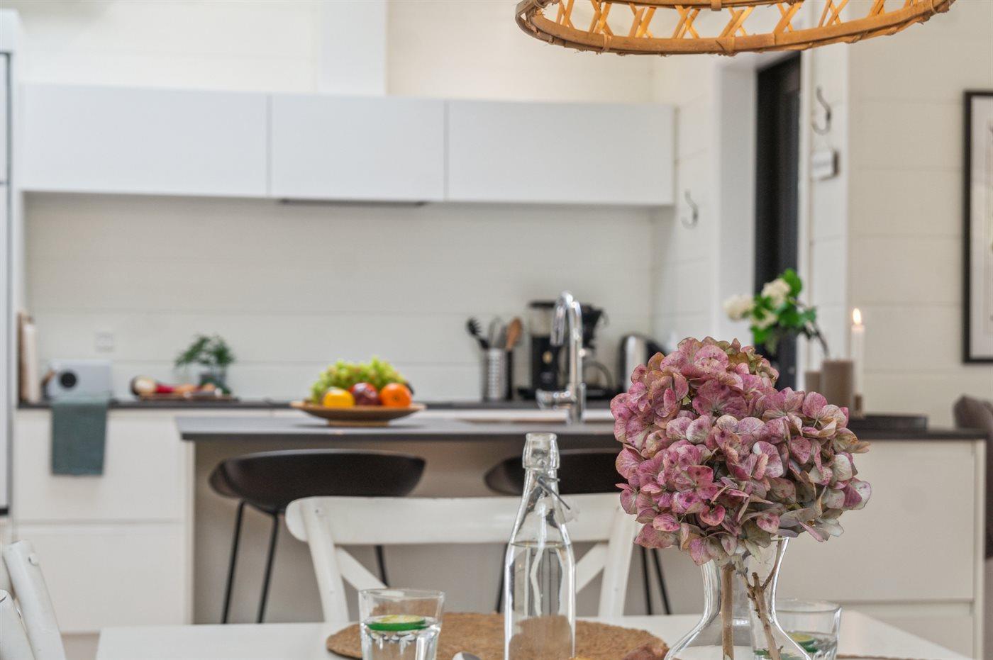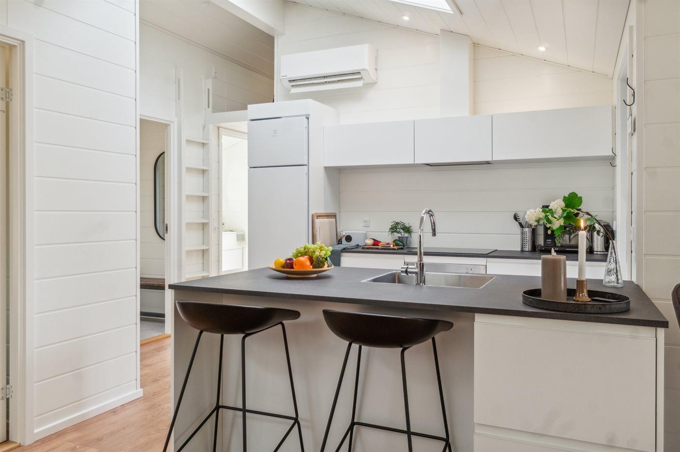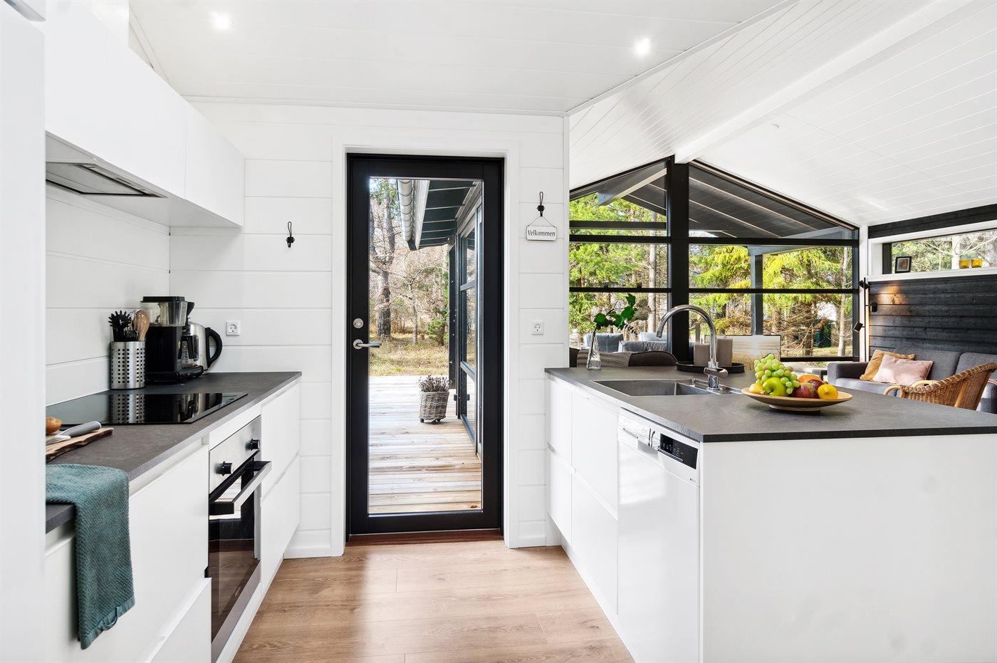 Køkkenet er udstyret med 1 køleskab. Der er 4 induktionskogeplader, varmluftovn samt opvaskemaskine.
