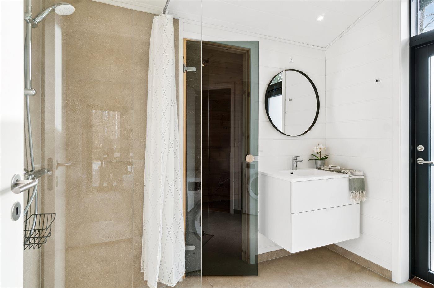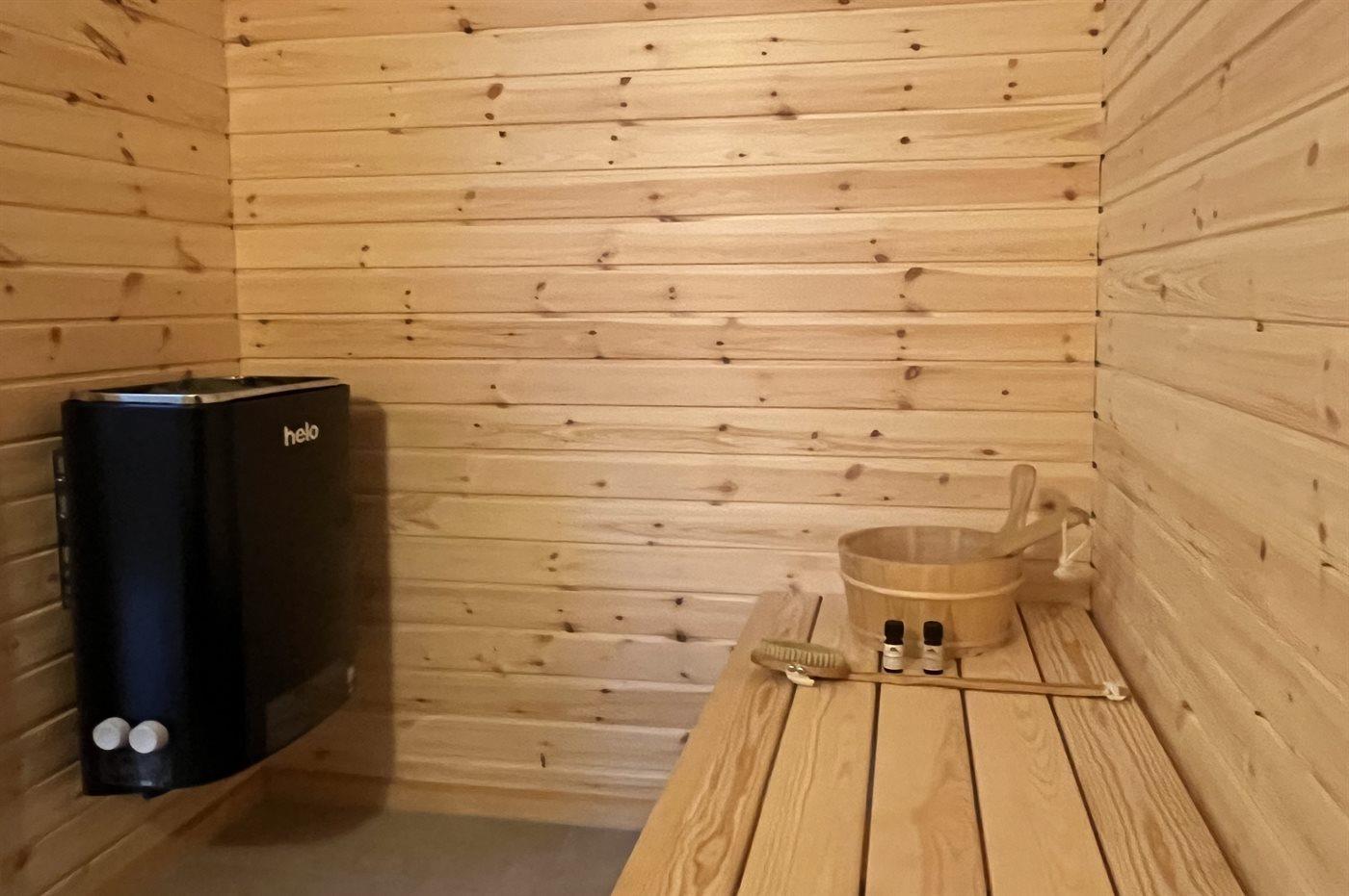Der er 1 badeværelse med bruseniche og 2 toiletter, heraf 1 gæstetoilet. Der er gulvvarme på 1 badeværelse. Der er gulvvarme på gæstetoilettet. I saunaen er der mulighed for afslapning.