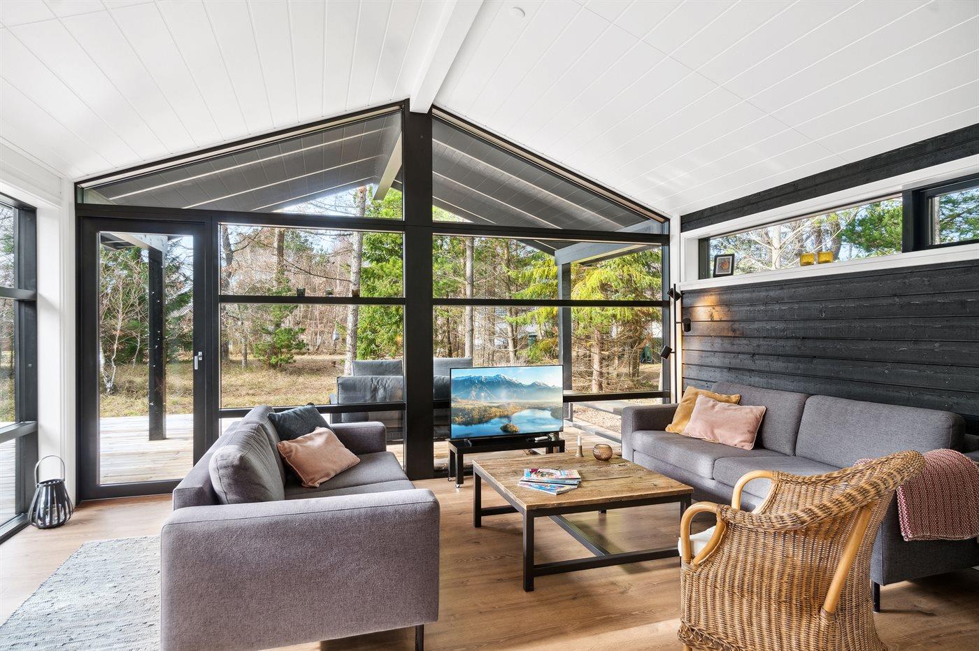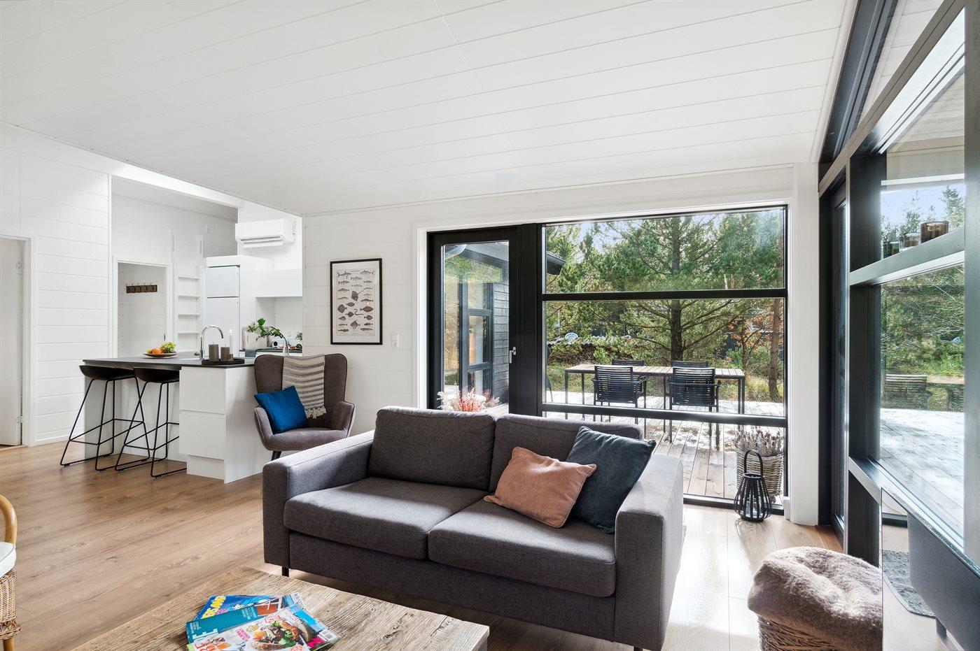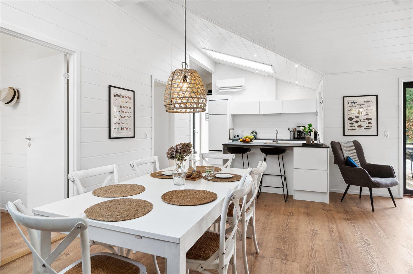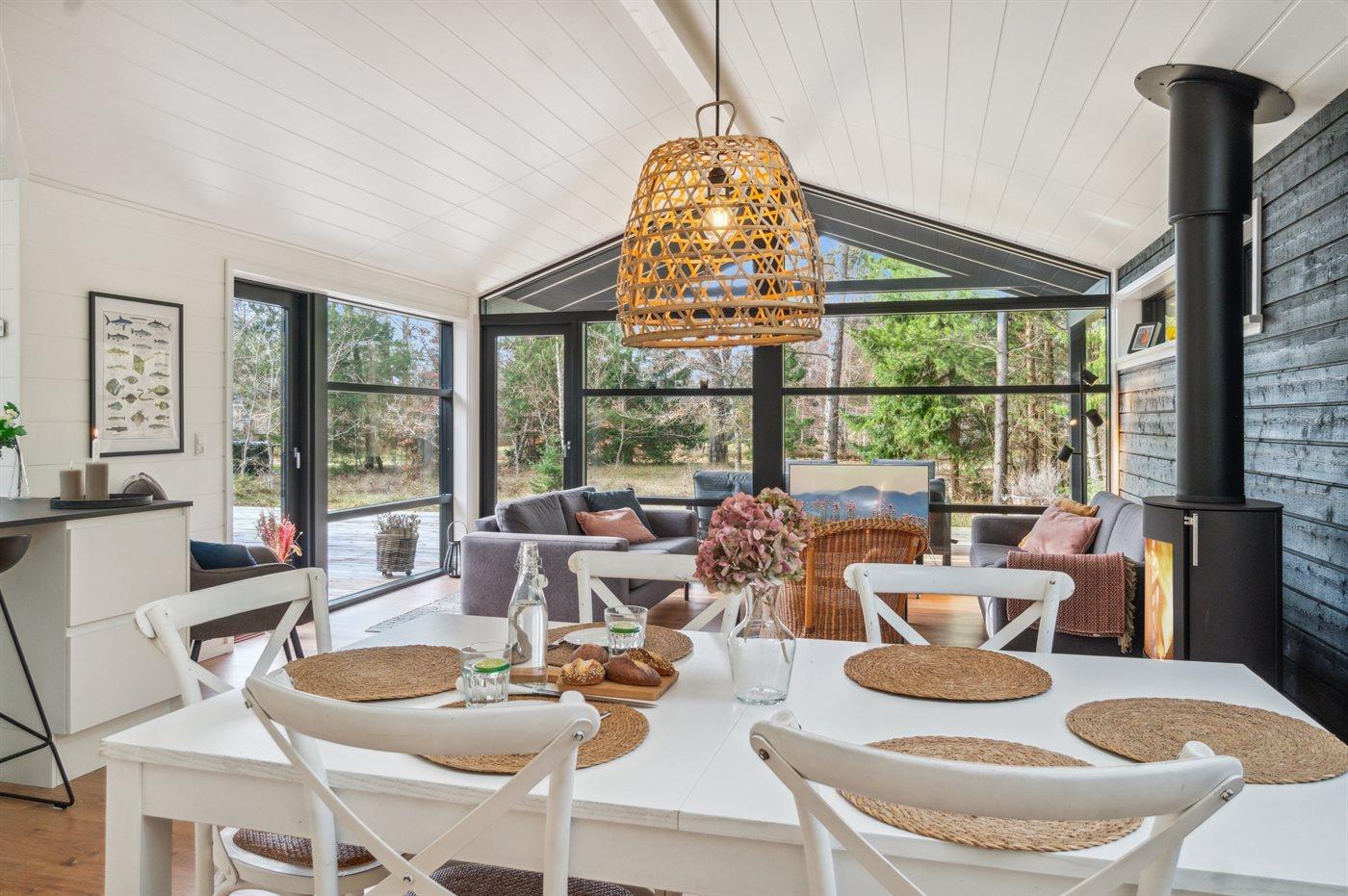 Huset er lyst og moderne med masser af lysindfald fra de store vinduespartier, og alle materialer er af høj kvalitet. Indretningen er moderne og sommerlig, og der er loft til kip i alle rum. Her er komfort og luksus, og overalt er huset hyggeligt, rart og bekvemt at være i.