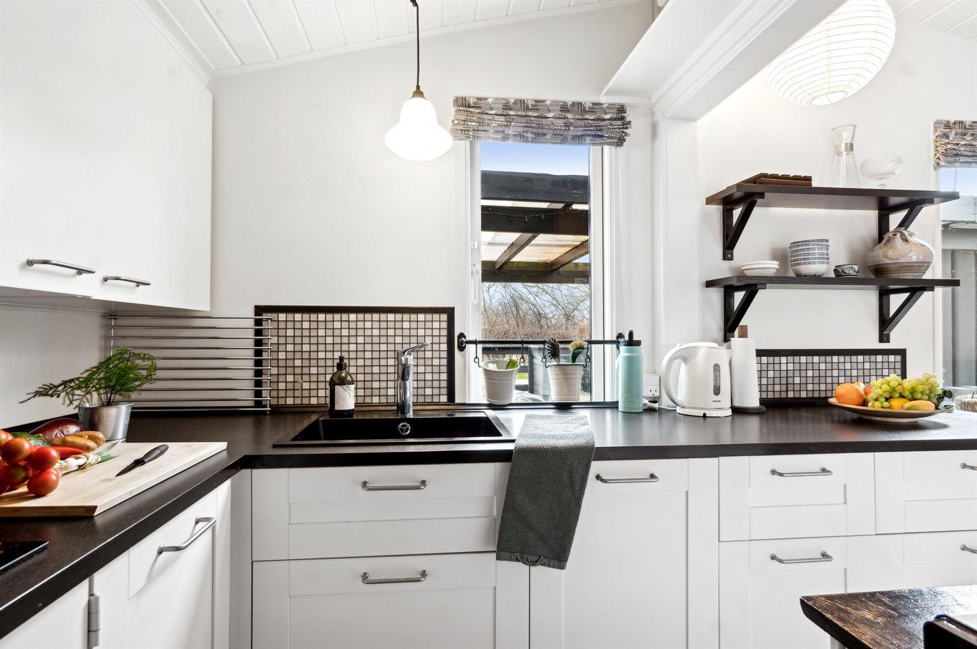 Det hyggelige køkkenalrum ligger i åben forbindelse med stuen og herfra er der udgang til den lyse udestue, hvor der kan tilbringes mange hyggelige timer. Der er flere gode terrasser med mulighed for at nyde solen men også for at finde læ og skygge. Der er bålsted til rådighed.