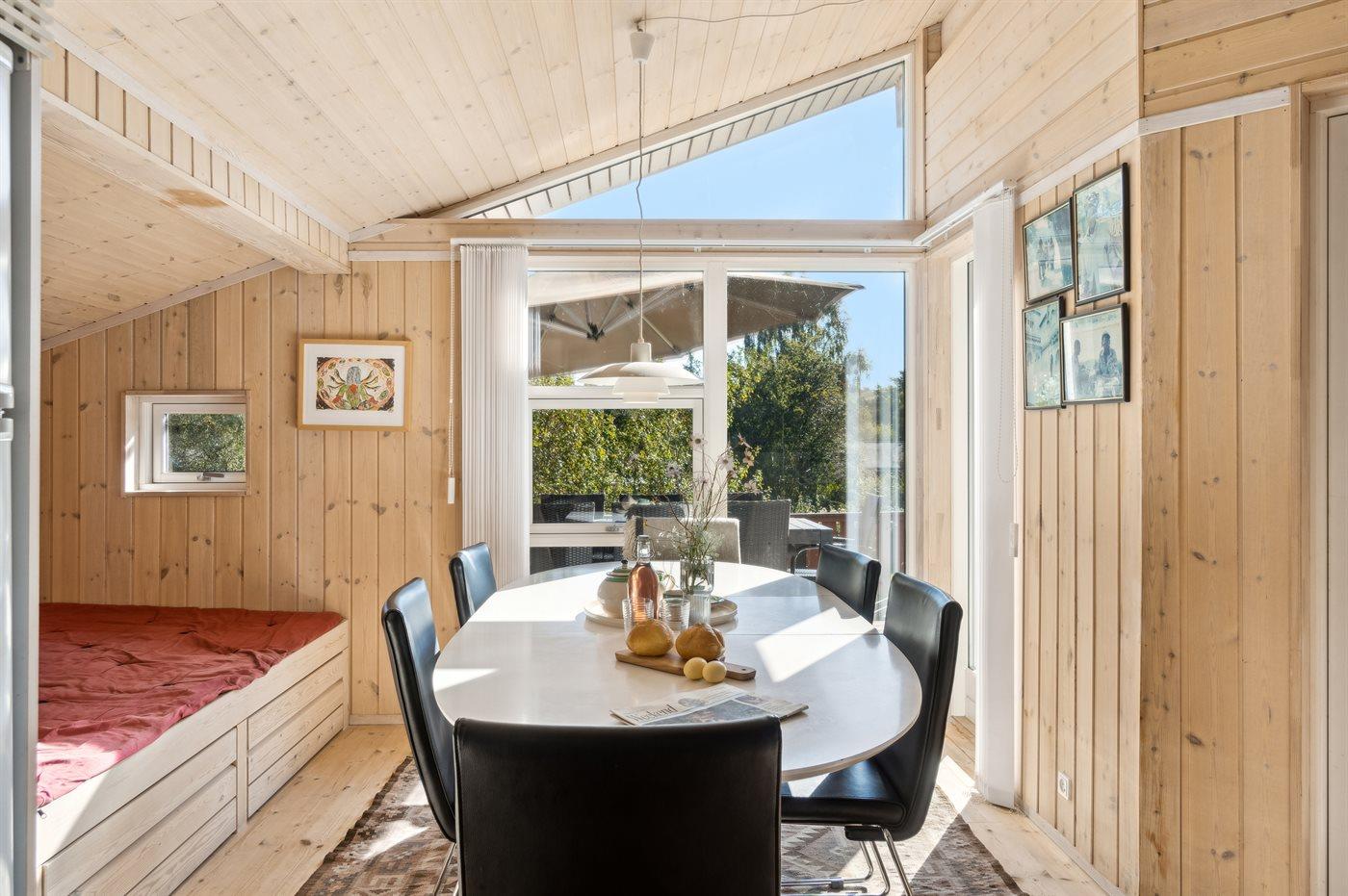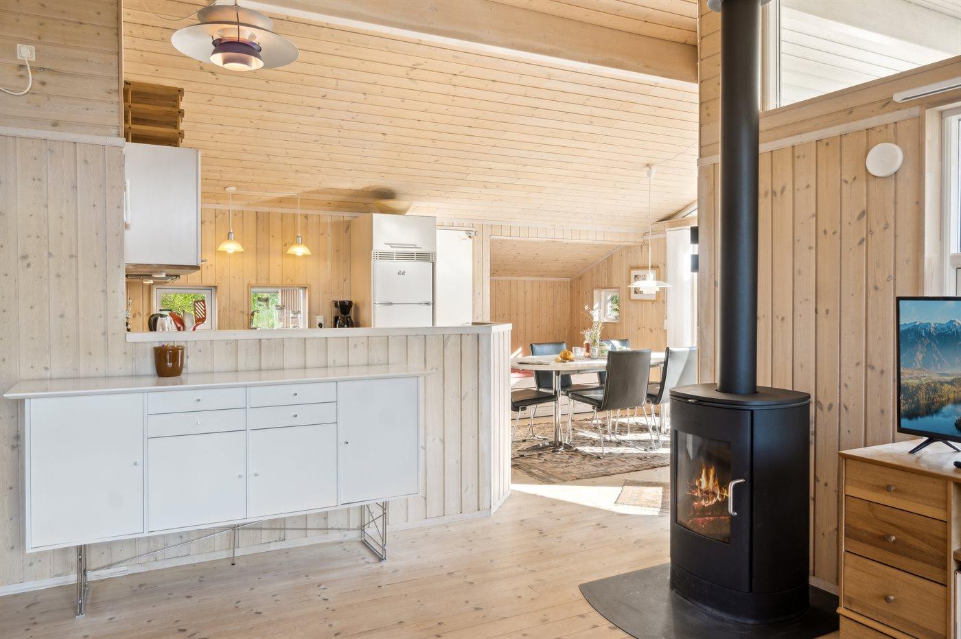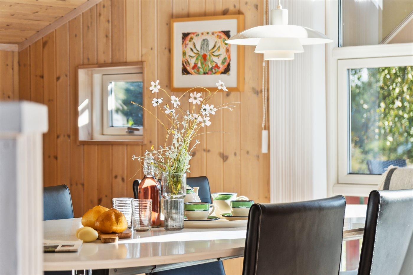 Det store køkkenalrum i åben forbindelse med stuen udgør det naturlige samlingspunkt. Herfra er der udgang til den overdækkede terrasse og det store syd- og vestvendte terrasseområde med udsigt over haven og det tilstødende naturområde. Der er 3 soveværelser med hver 2 sovepladser og med skabe. I køkkenalrummet er desuden en hyggelig alkove med 2 sovepladser. Der er 2 badeværelser med bruseniche og gulvvarme. I det største badeværelse er der desuden spa og vaskemaskine.