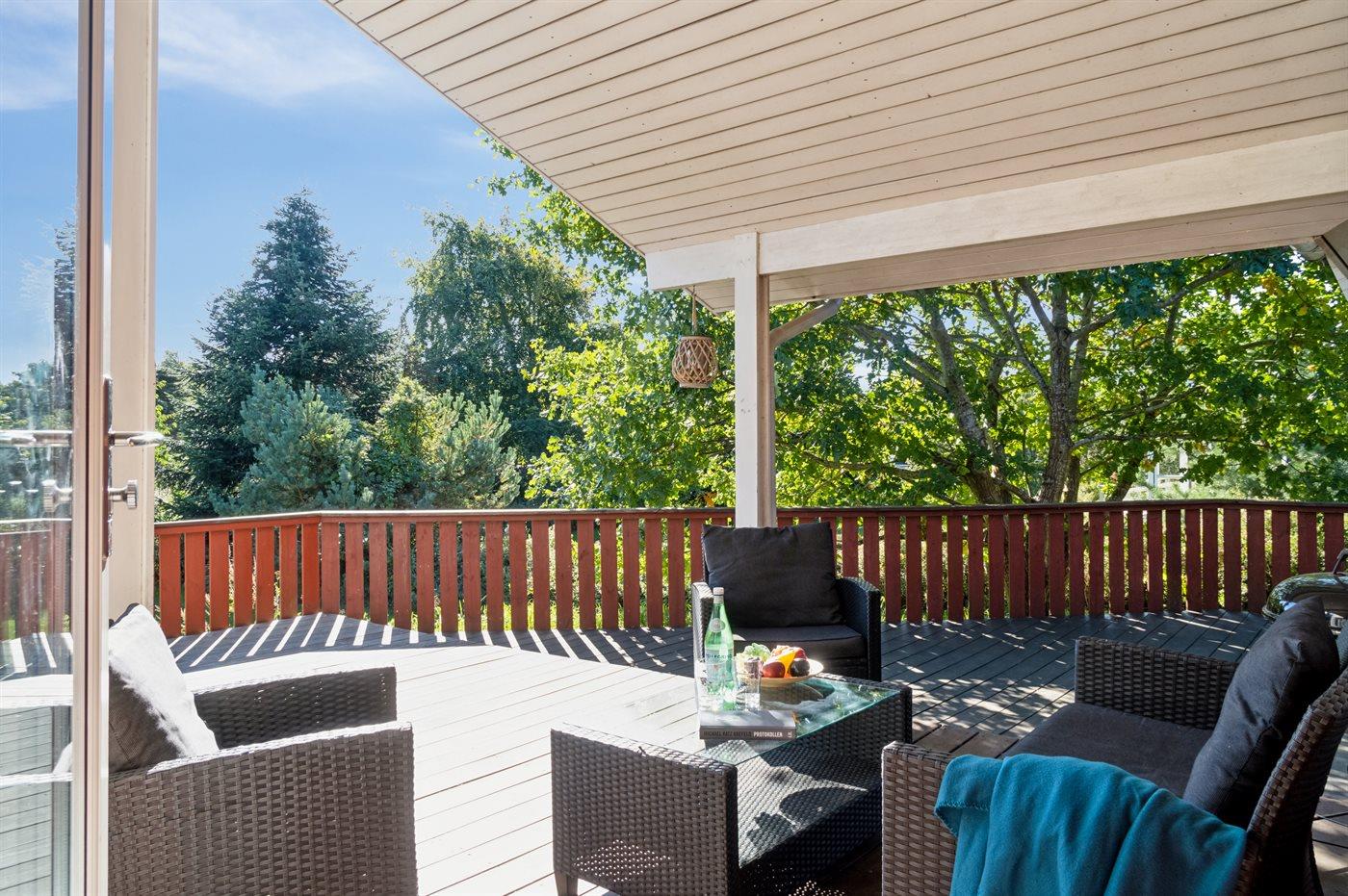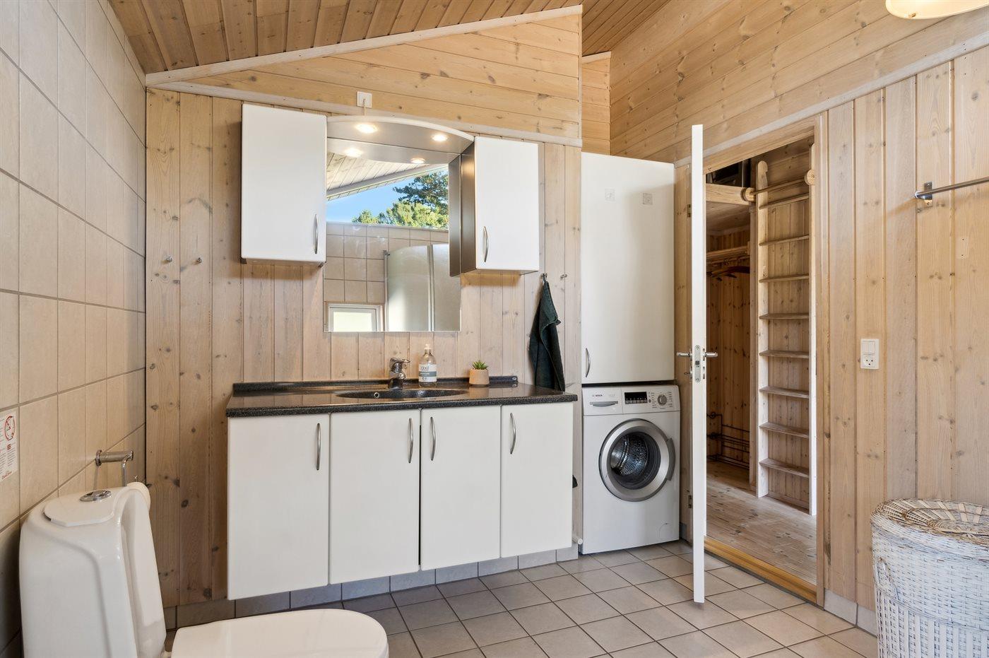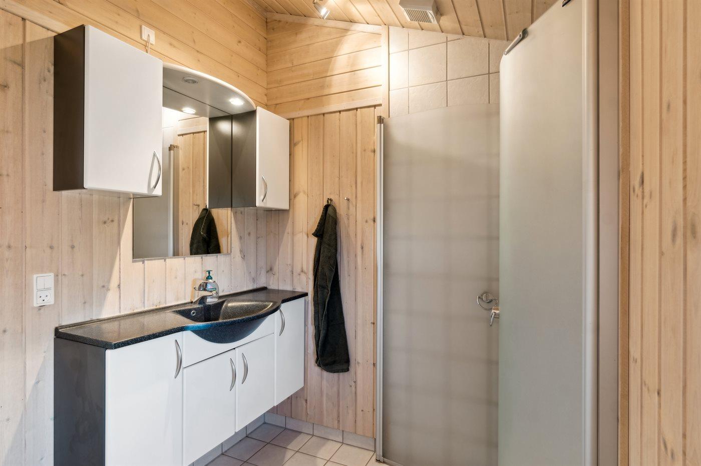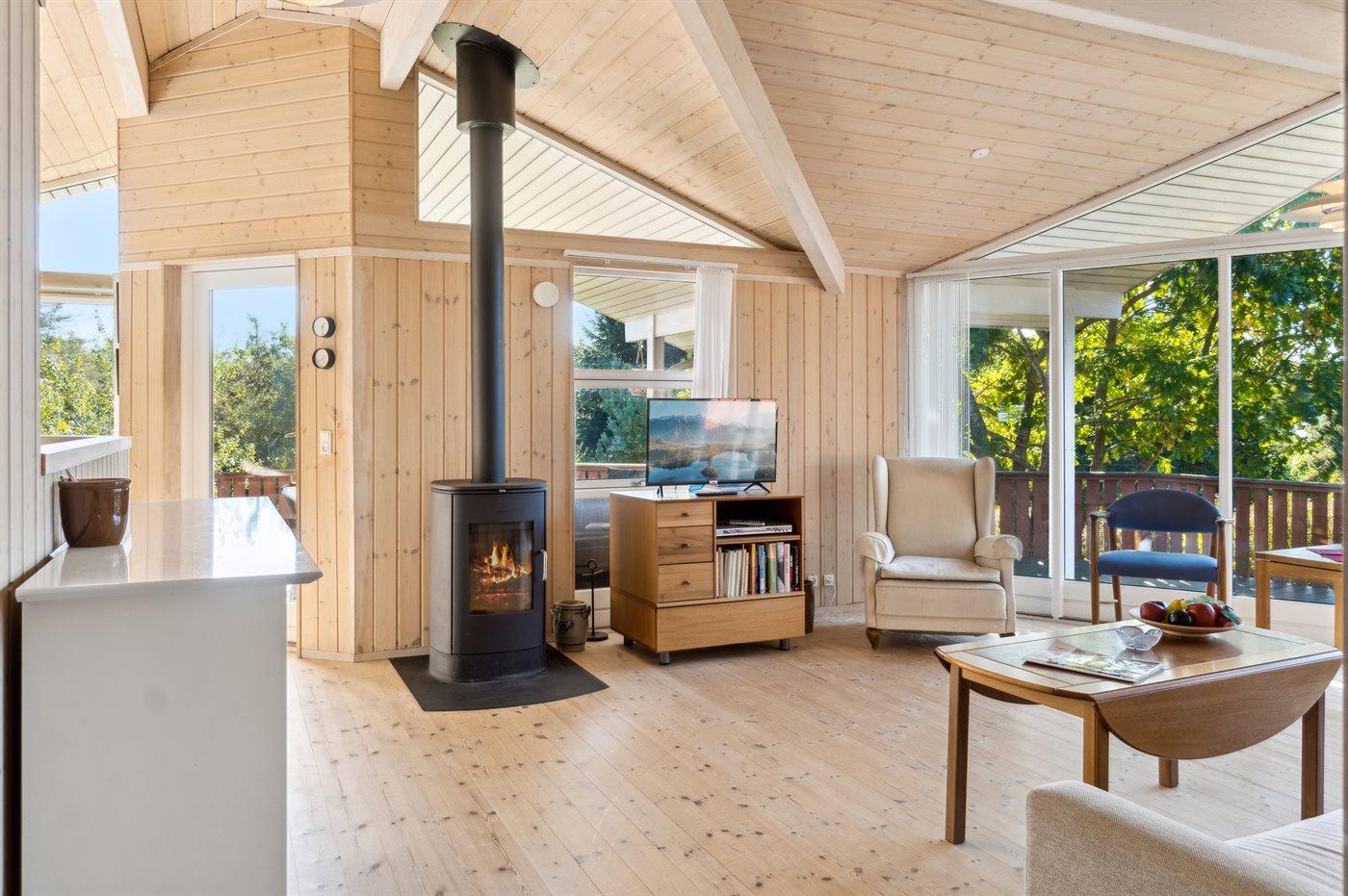 Det store køkkenalrum i åben forbindelse med stuen udgør det naturlige samlingspunkt. Herfra er der udgang til den overdækkede terrasse og det store syd- og vestvendte terrasseområde med udsigt over haven og det tilstødende naturområde. Der er 3 soveværelser med hver 2 sovepladser og med skabe. I køkkenalrummet er desuden en hyggelig alkove med 2 sovepladser. Der er 2 badeværelser med bruseniche og gulvvarme. I det største badeværelse er der desuden spa og vaskemaskine.