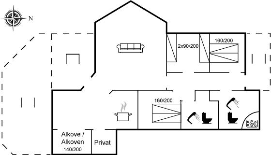 Der er i alt 3 soveværelser. Sovepladserne fordeler sig på: 4 sovepladser i dobbeltsenge. 2 sovepladser i enkeltsenge. 2 sovepladser i alkove. 2 af disse sovepladser befinder sig i stuen.