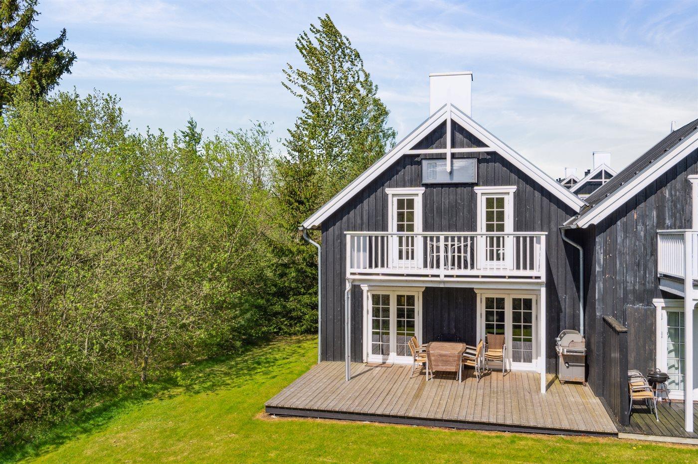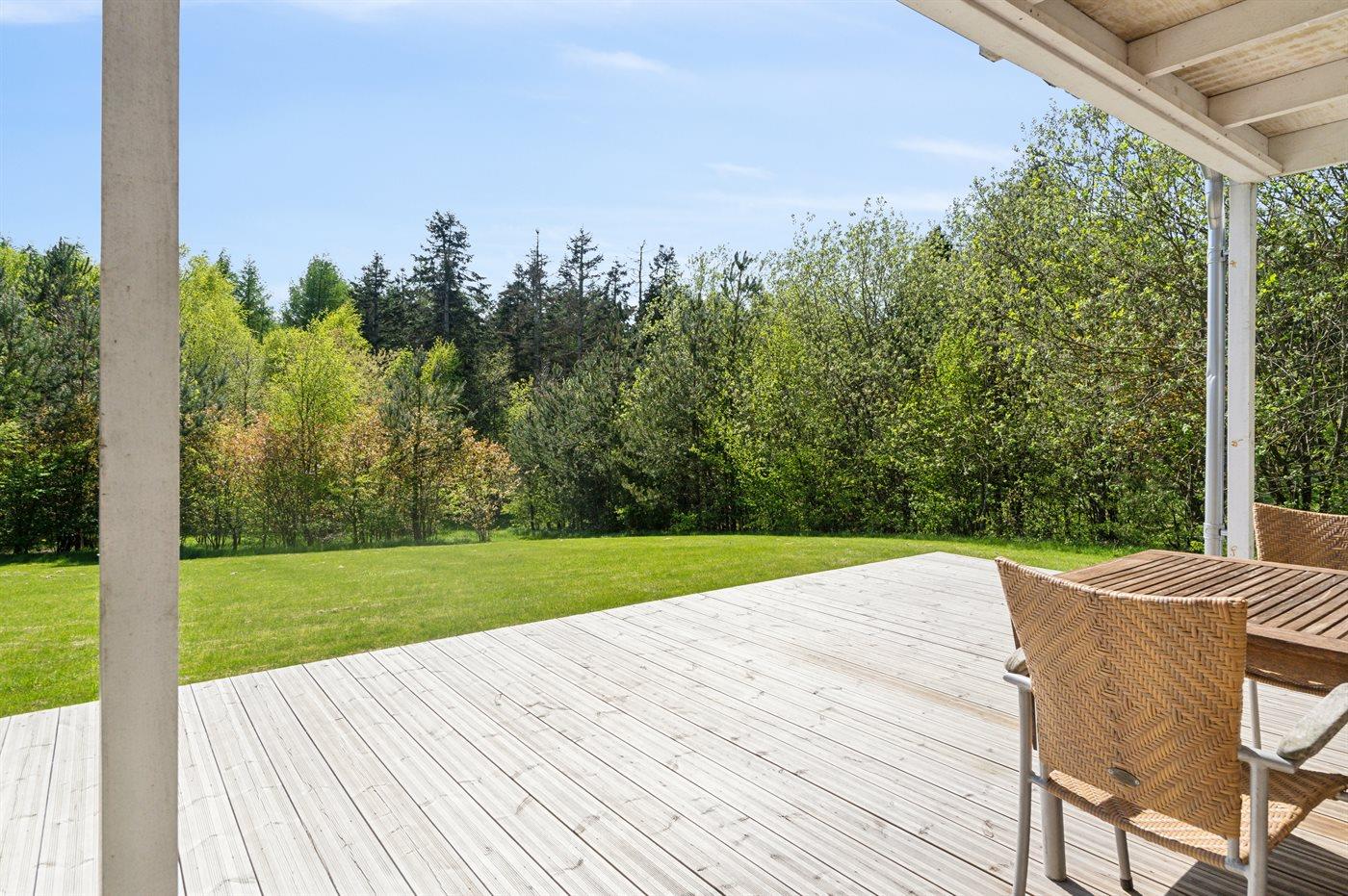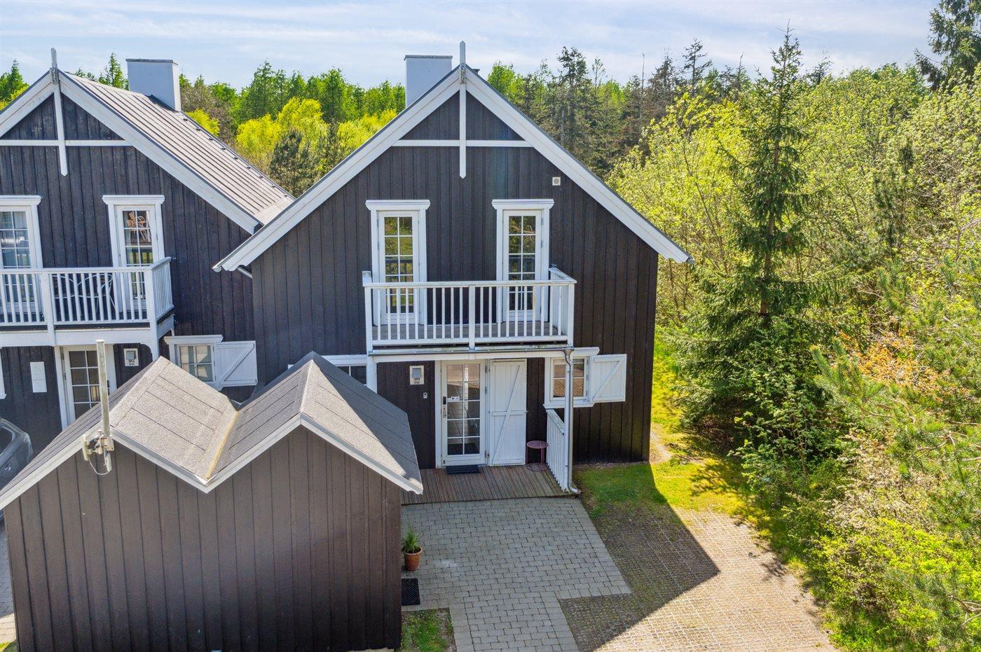 Moderne sommerhus i Gjern med stor terrasse, skovudsigt og adgang til feriecenterets mange aktiviteter.