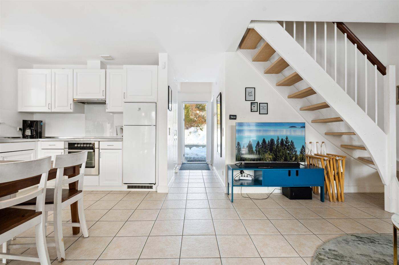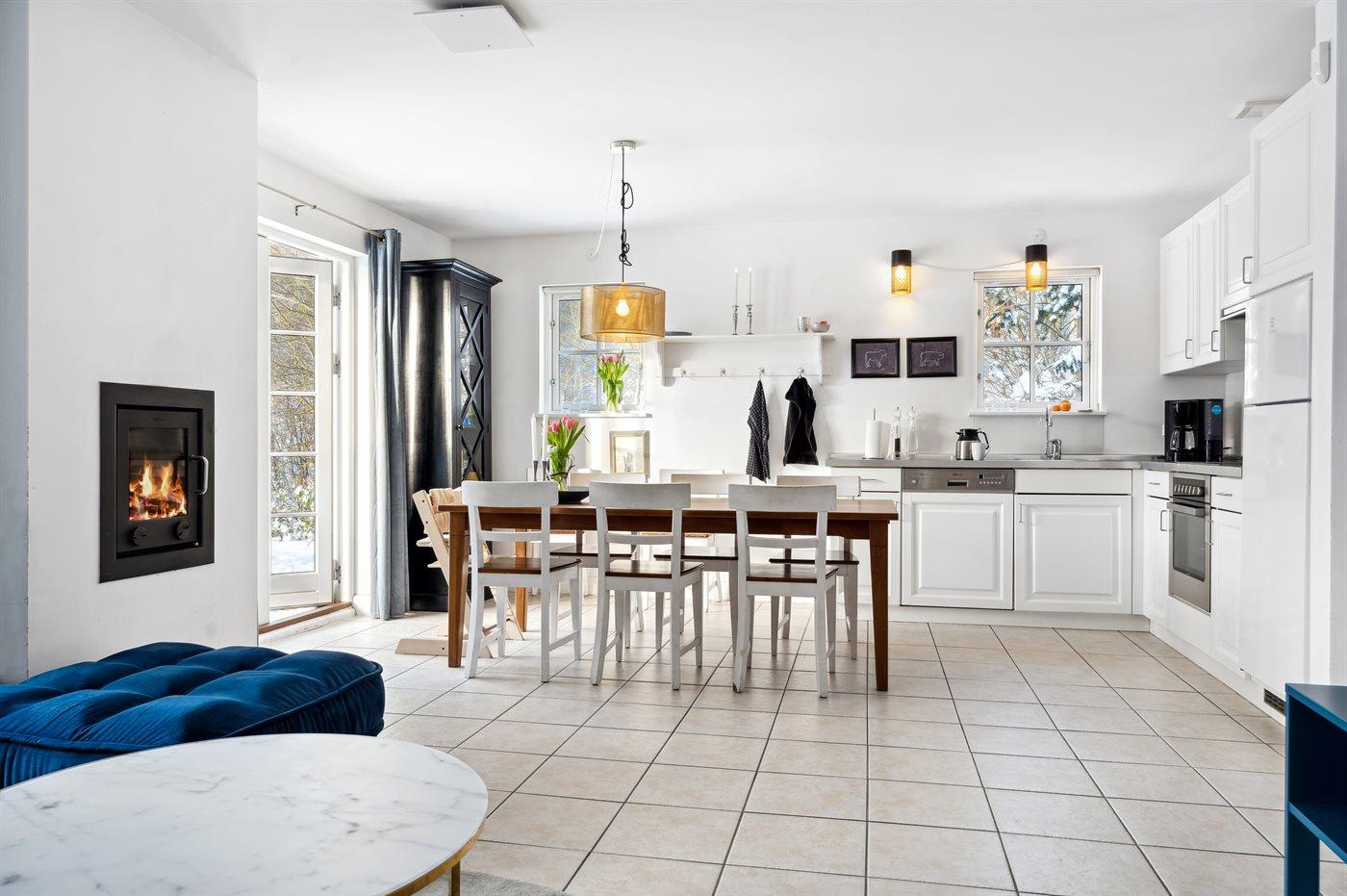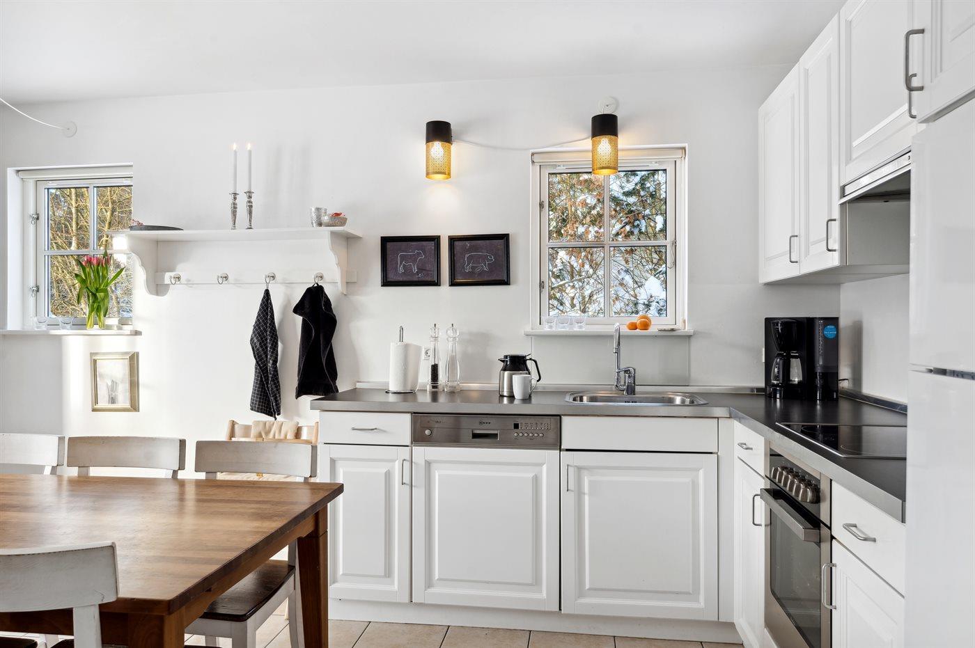 Køkkenet er udstyret med 1 køleskab. Der er 4 keramiske kogeplader, varmluftovn samt opvaskemaskine.
