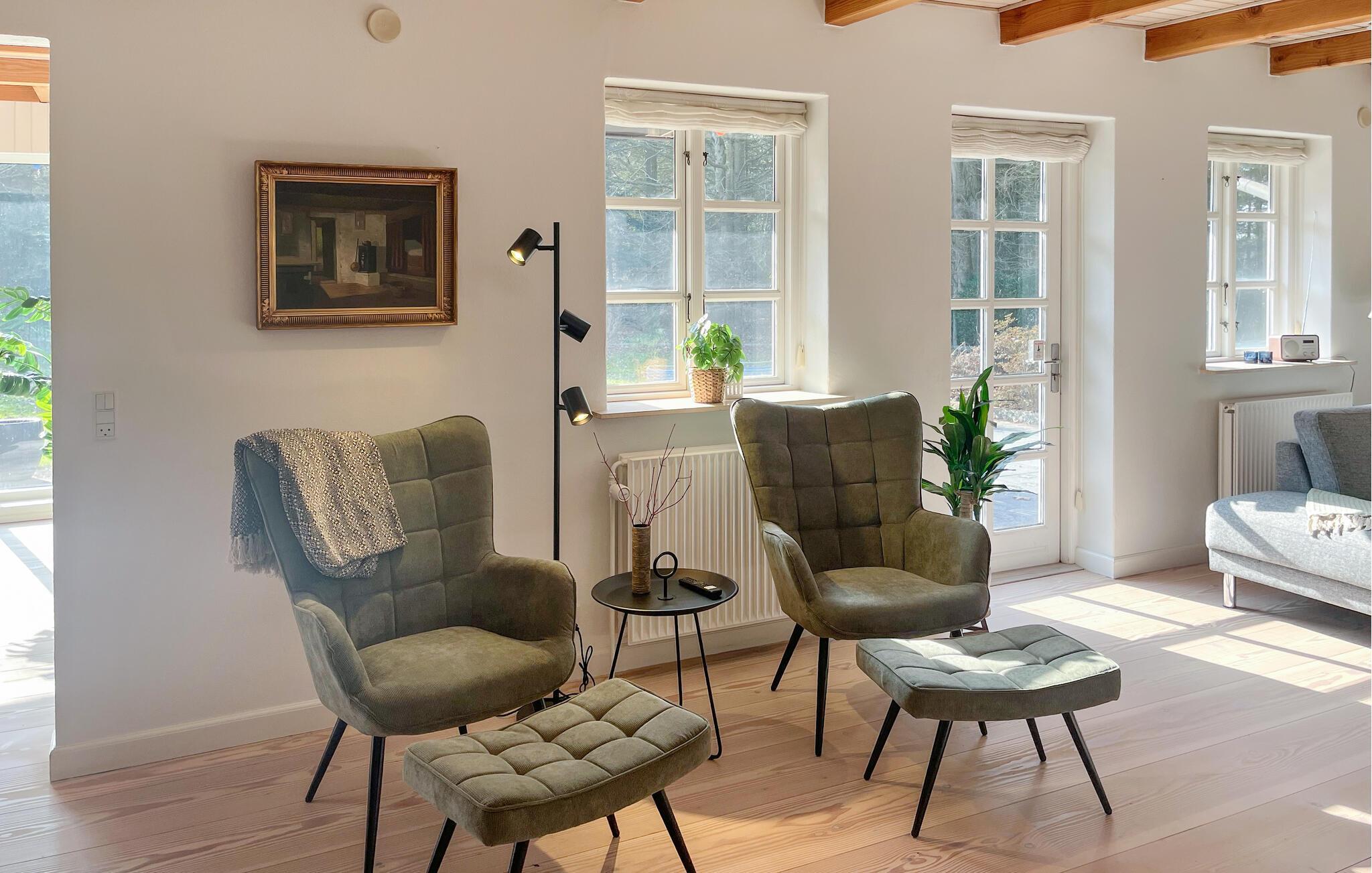 Velkommen til dette skønne landsted, som er oplagt til flere familier eller en stor gruppe venner, da huset er godt delt op i to adskilte afdelinger. Her kan I kombinere hygge med sjove aktiviteter og fortryllende naturoplevelser. Husets indre er noget særligt med rummelige værelser og gode indretningsdetaljer. Nyd dagens pauser i den lyse opholdsstue eller mærk den behagelige varme fra spabadet - det er ren luksus efter en aktiv dag. Den store spiseplads i udestuen giver plads til, at alle kan nyde måltiderne sammen. Indretningen kombinerer rustikke elementer med moderne komfort, hvilket giver jer de ideelle betingelser for at slappe af. I kan se frem til et skønt ophold i en bolig, der også er handicapvenlig.